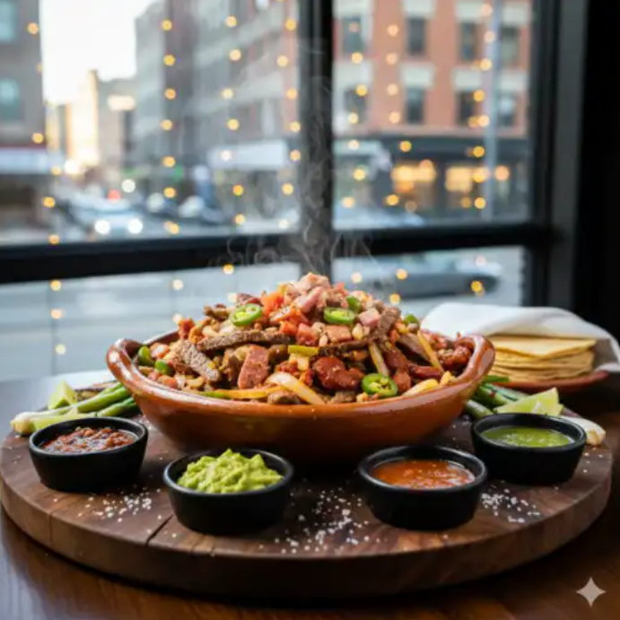 Tira de res con papas, vegetales, queso seco, crema y consomé.