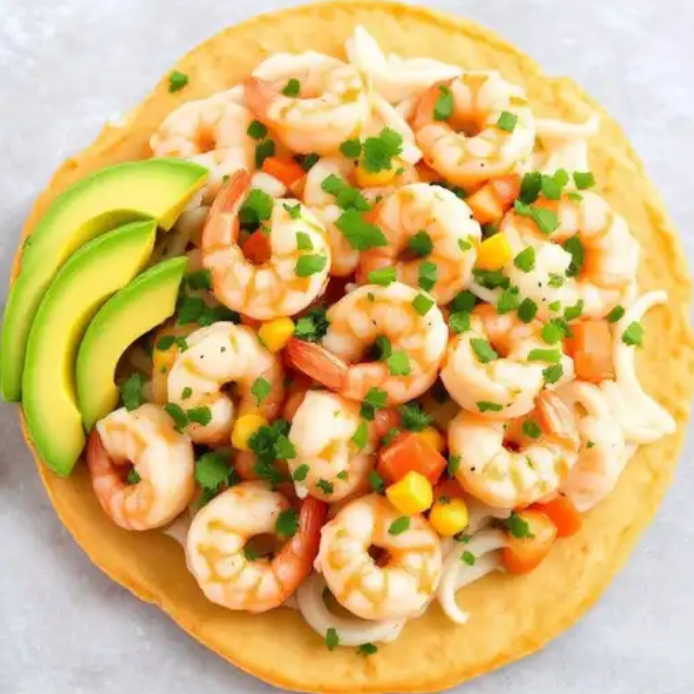 Tostada de ceviche de camarón, fresca y acompañada de aguacate.