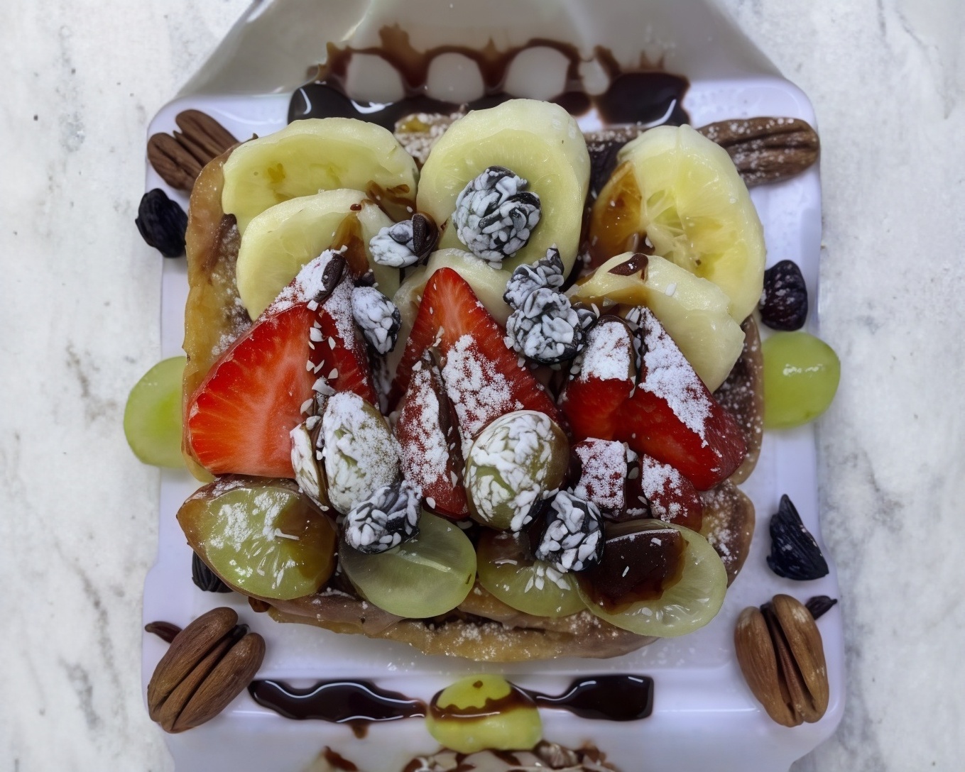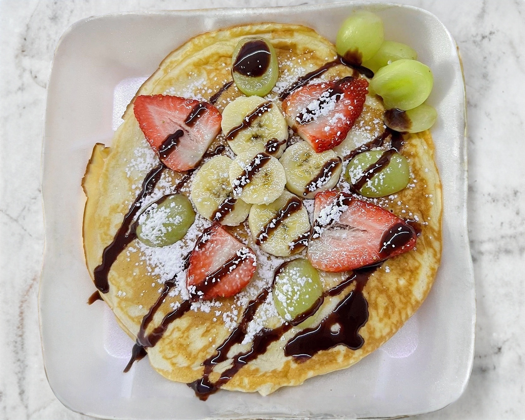 3 Panes franceces con azucar glaseada + chocolate liquido + fruta