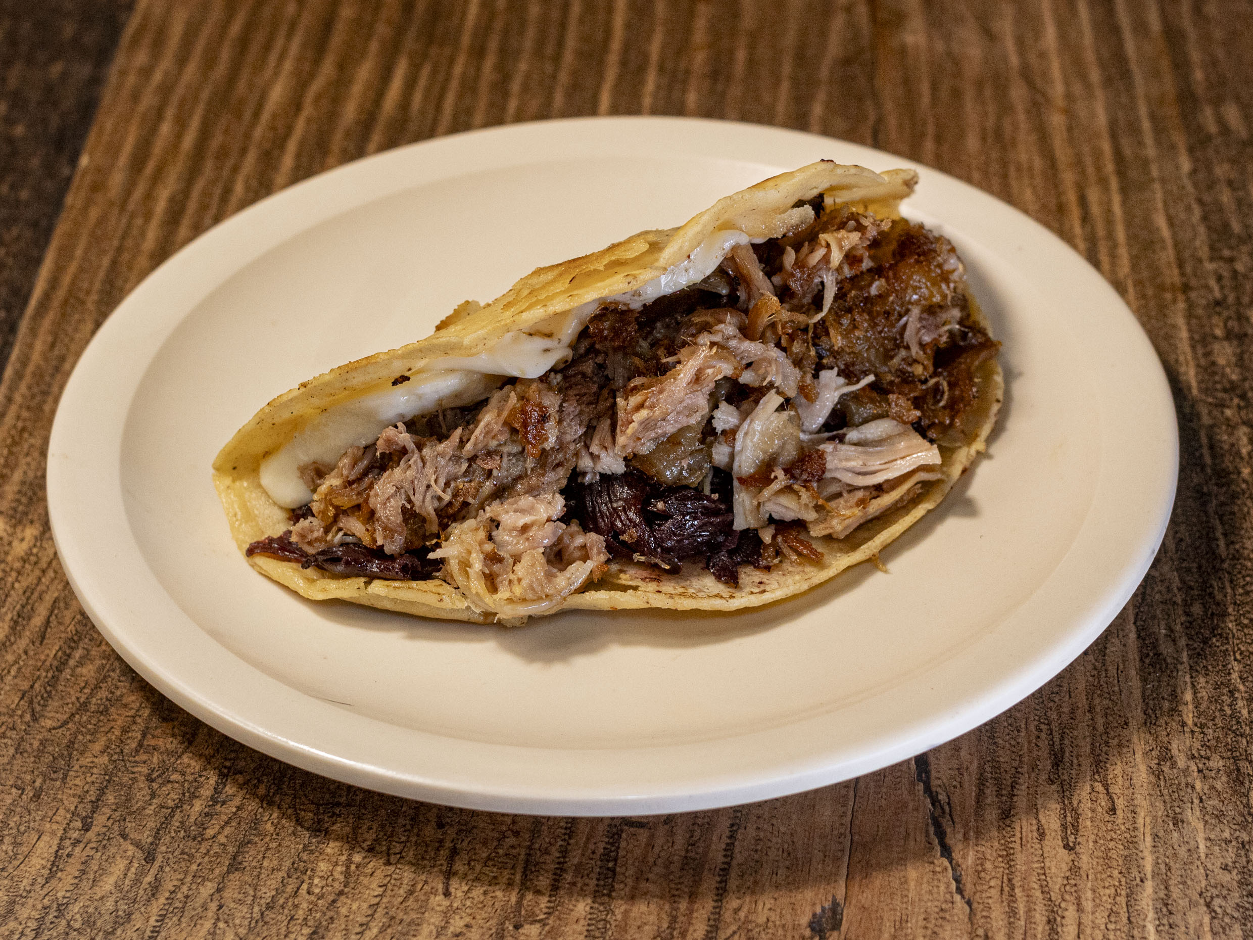 Jamaica, queso Oaxaca y carnitas.