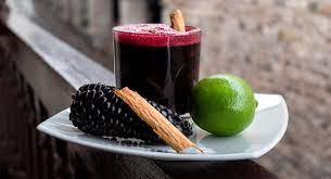 Bebida de maíz morado, hervida con frutos y especias aromáticas con un toque de limón.
