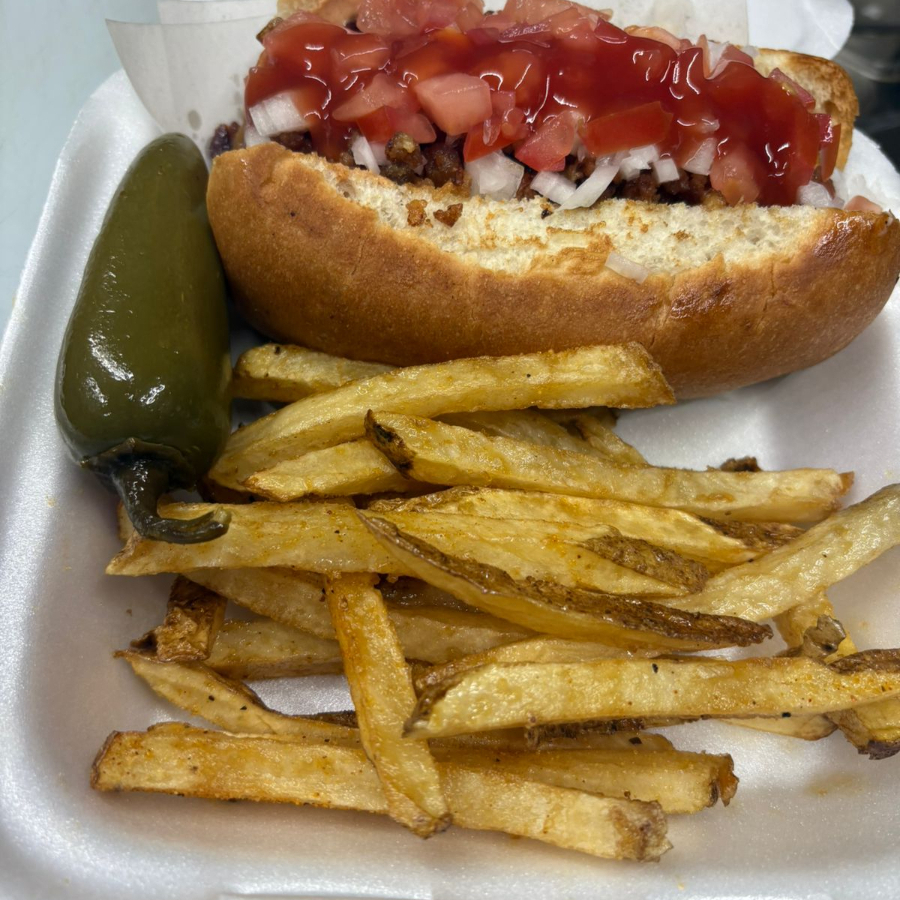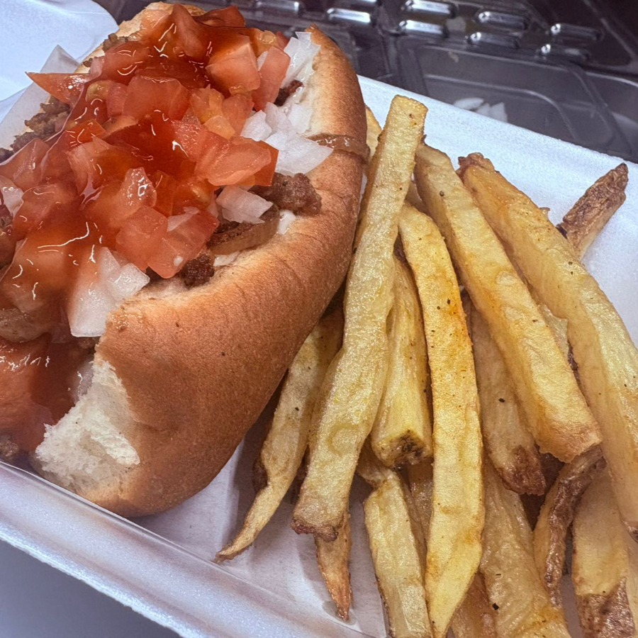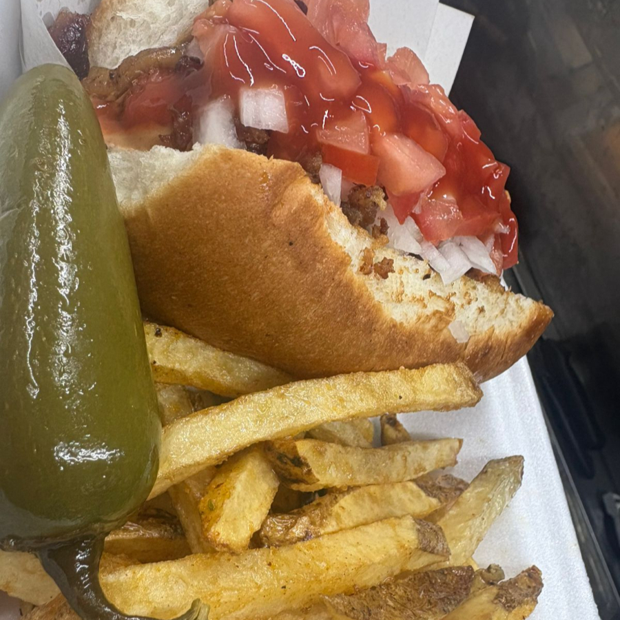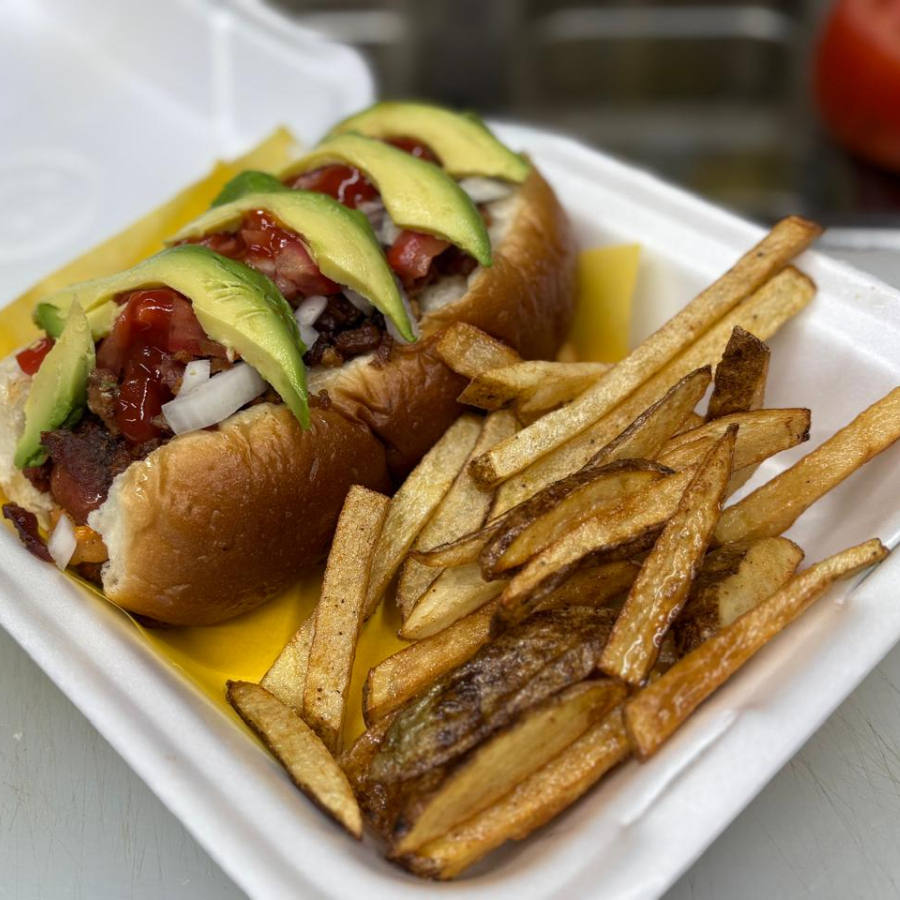 Pan suave con aderezo chipotle y mayonesa, salchicha, cebolla caramelizada, tocino, Adobada, tomate, cebolla y catsup. INCLUYE PAPAS FRITAS.