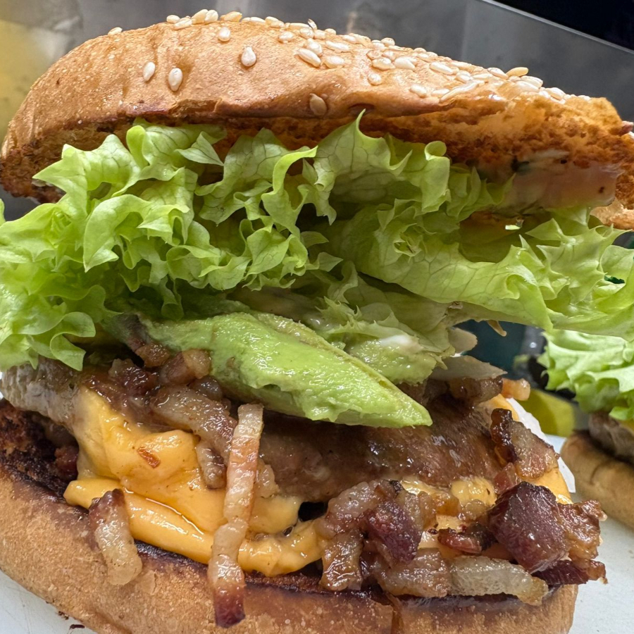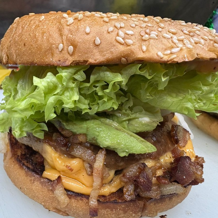 150gr de carne, aderezos de la casa, queso americano, carne adobada, cebolla, aguacate, lechuga.