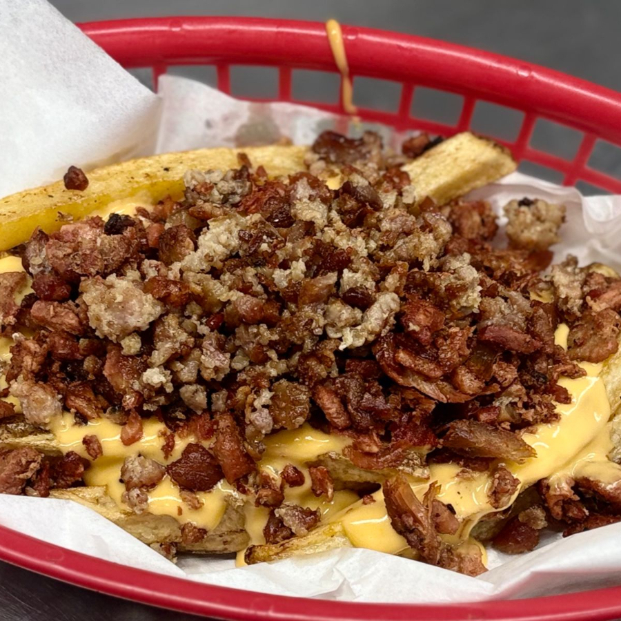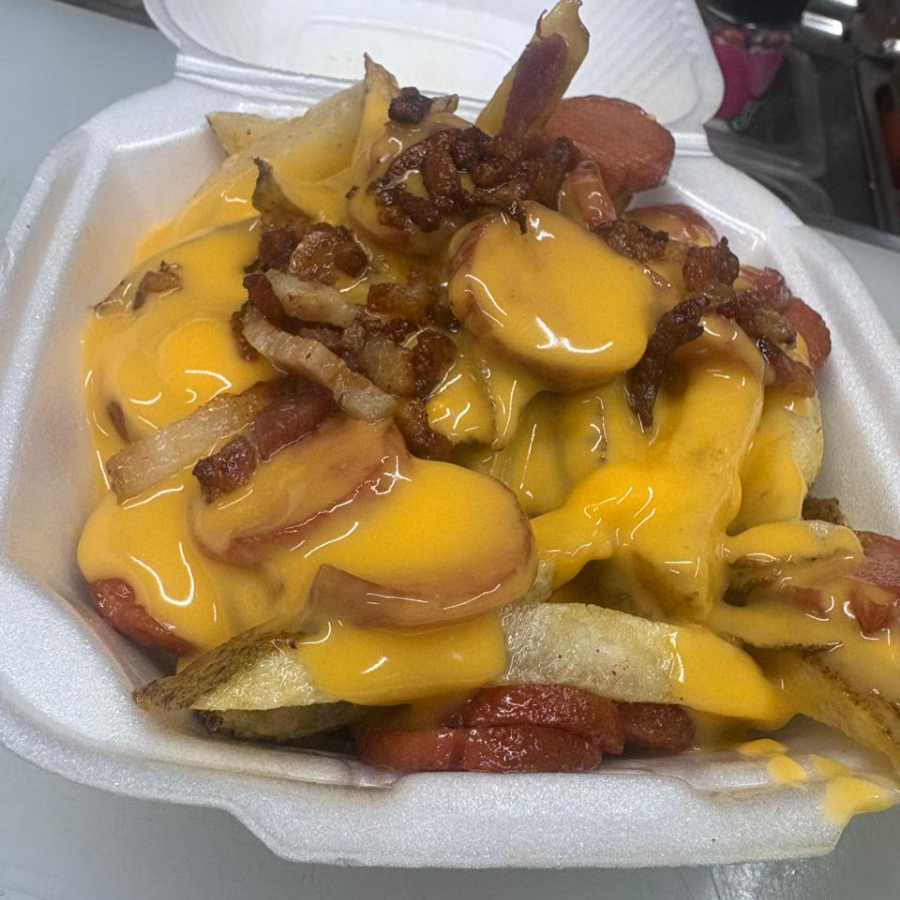 Trocitos de salchicha con papas fritas naturales, tocino. Y queso de nachos.