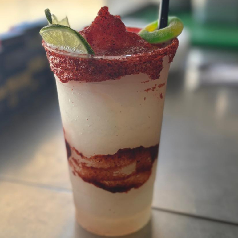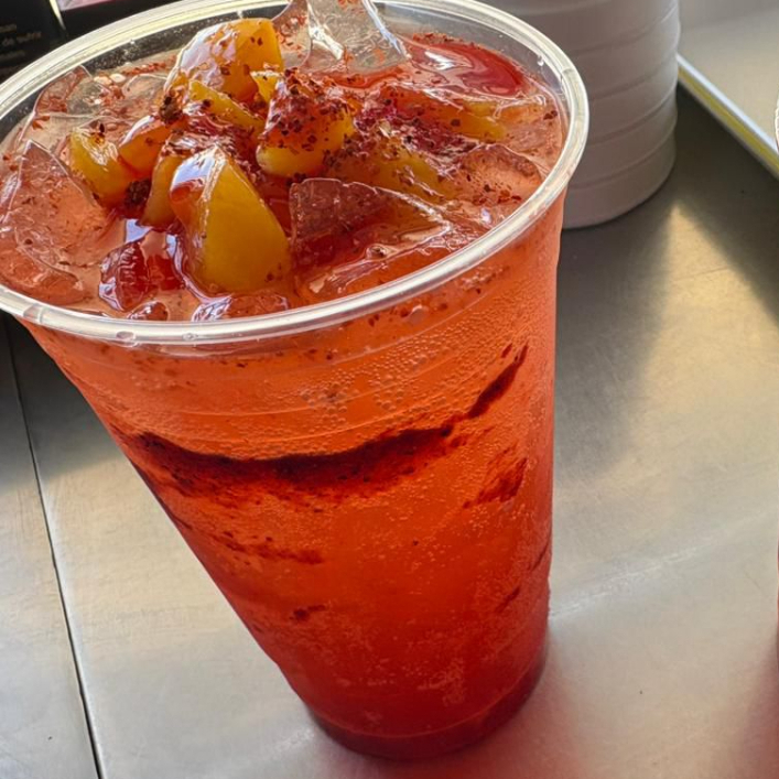 Tamaño 32oz, con agua mineral, chilito en polvo y chamoy