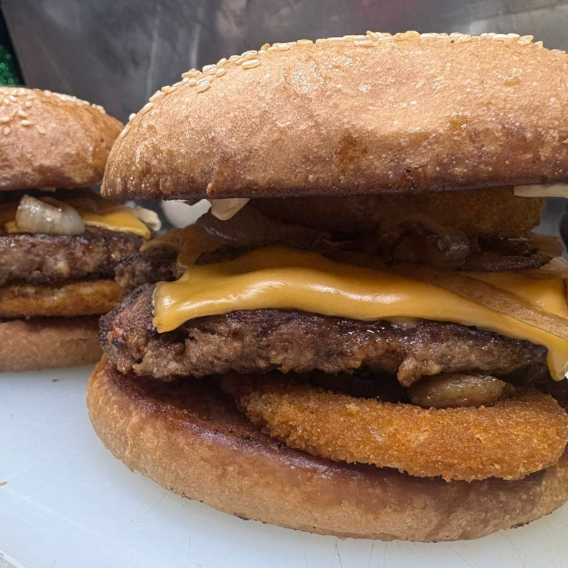 150gr de carne, aderezos de la casa, cebolla asada, queso americano, tocino, aros de cebolla y BBQ