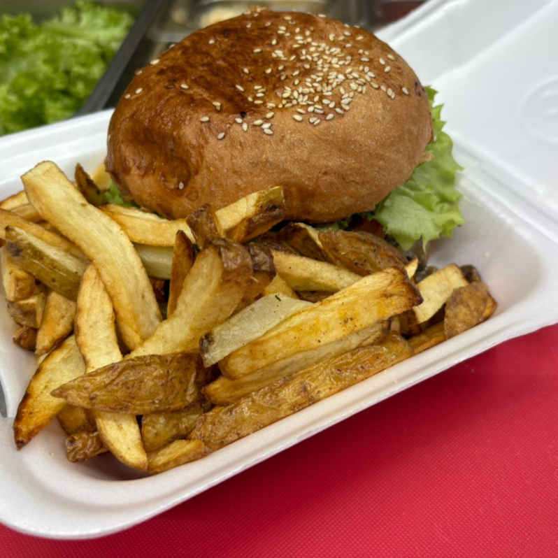 150gr de carne, aderezo de la casa, queso americano, tomate, cebolla, pepinillos. INCLUYE PAPAS FRITAS NATURALES.