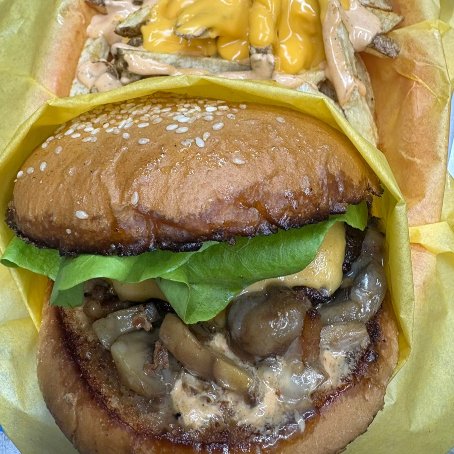 150gr de carne, queso americano, champiñones preparados con tocino y cebolla asada, tomate, lechuga, cebolla, y aderezo de la casa.