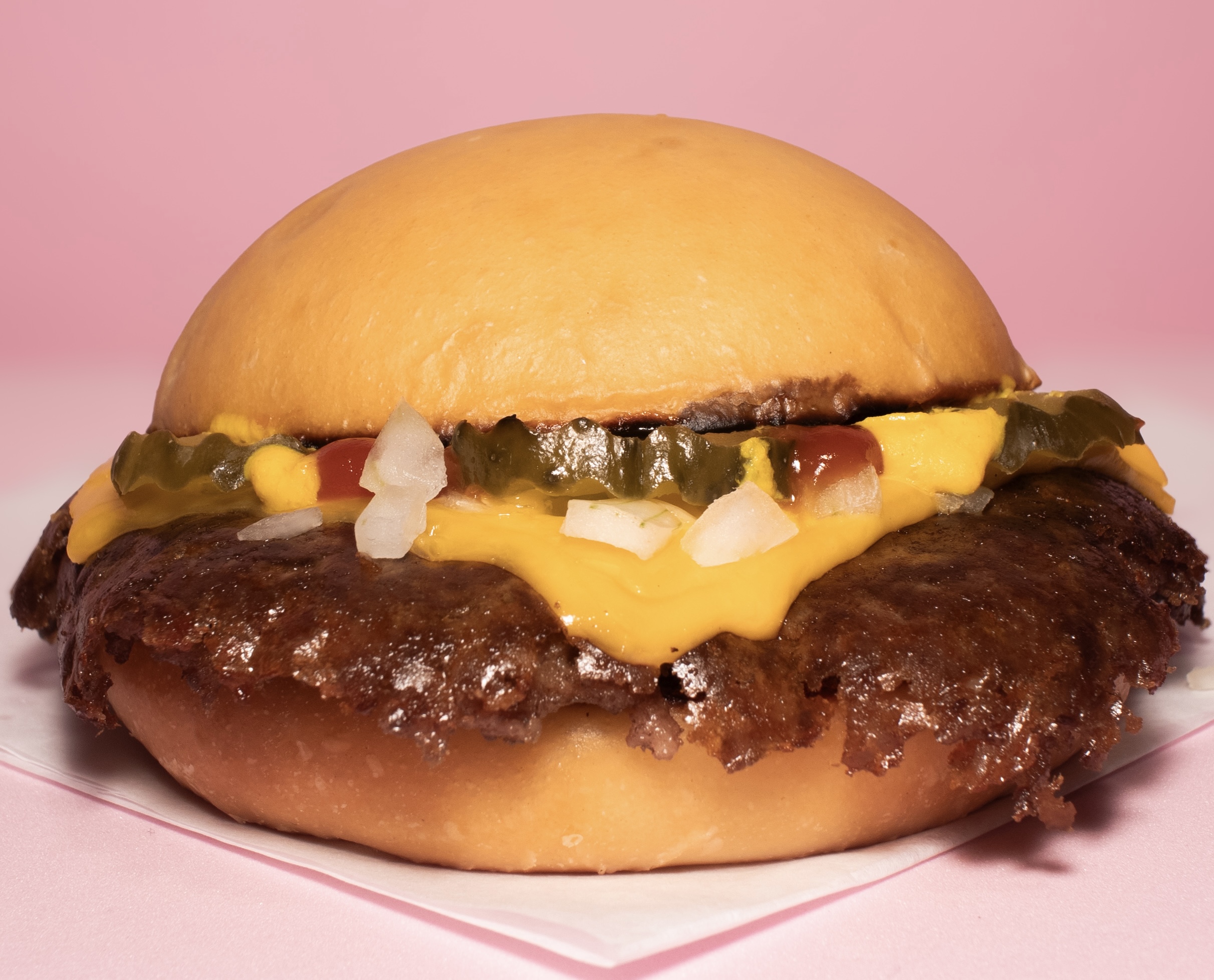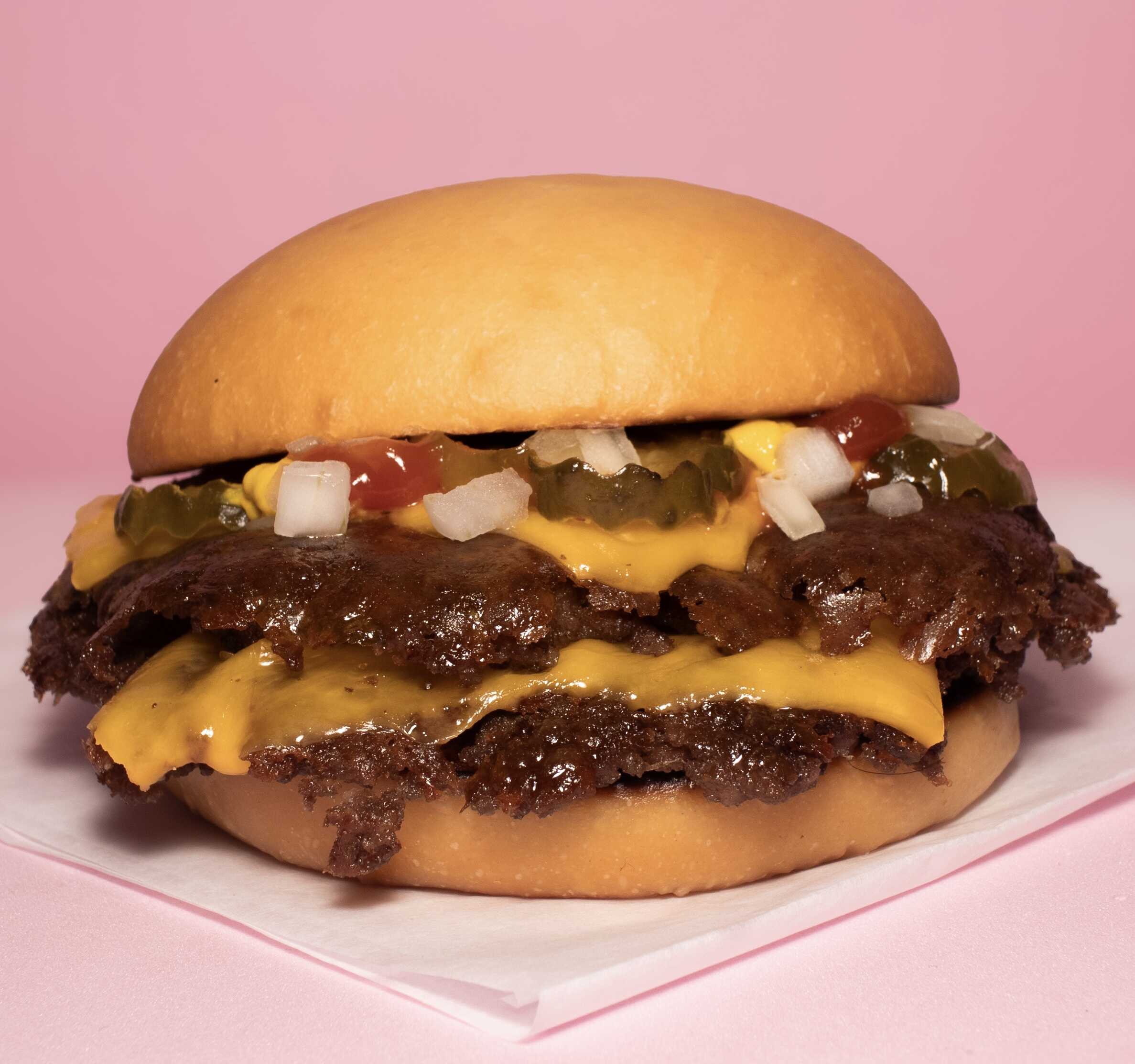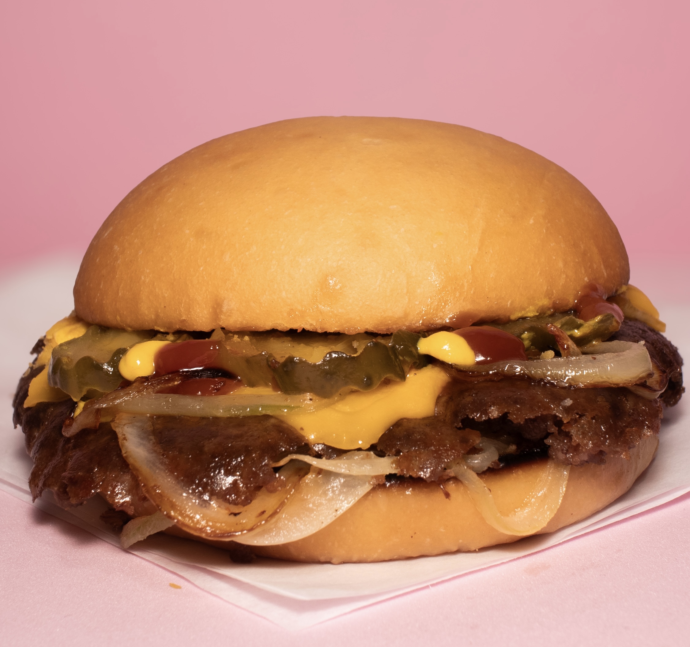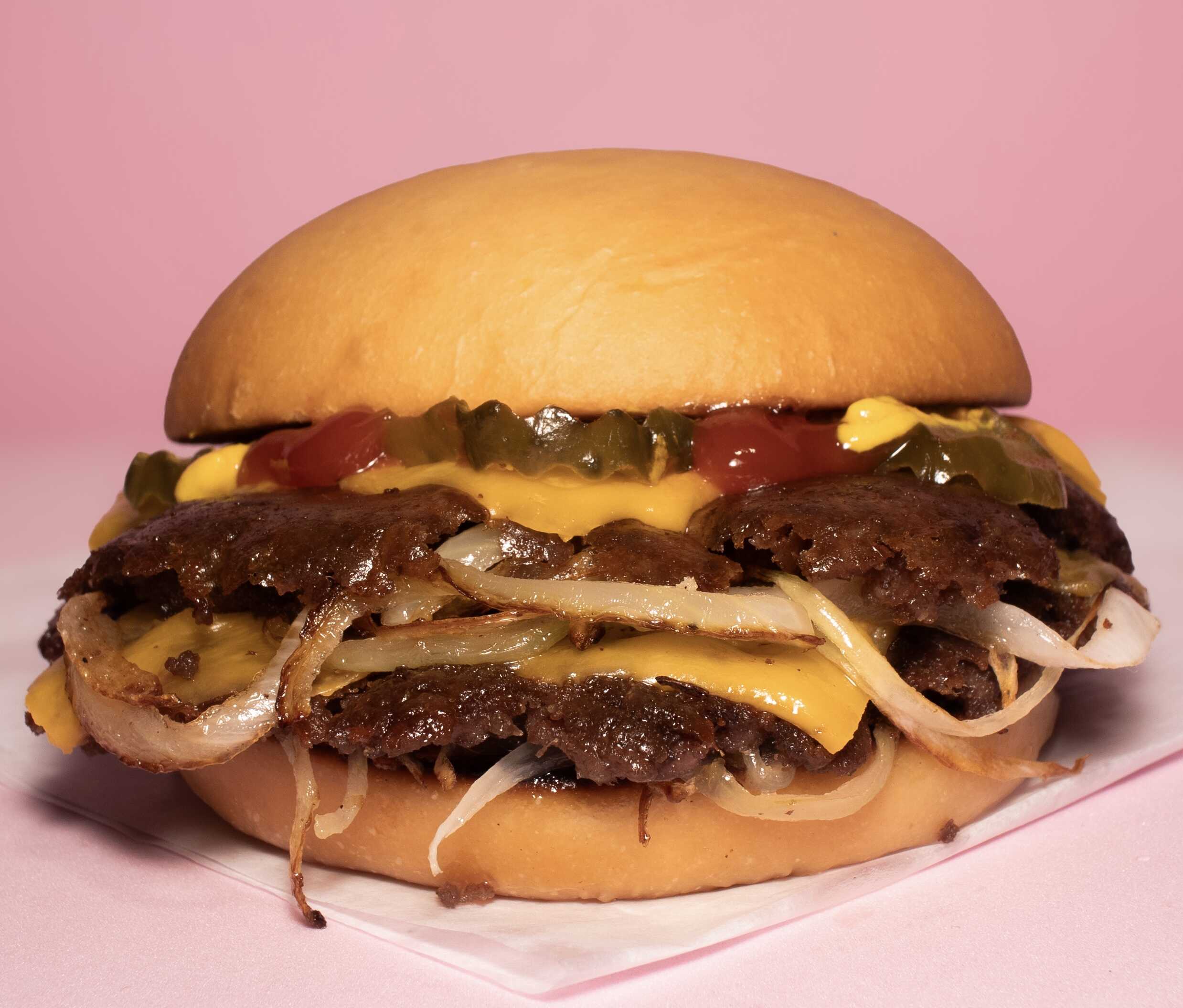Doble carne 100 % de res smashiada con tiras de cebolla, pan de papa artesanal recién horneado, queso americano, pepinillos artesanales, mayonesa, cátsup y mostaza.