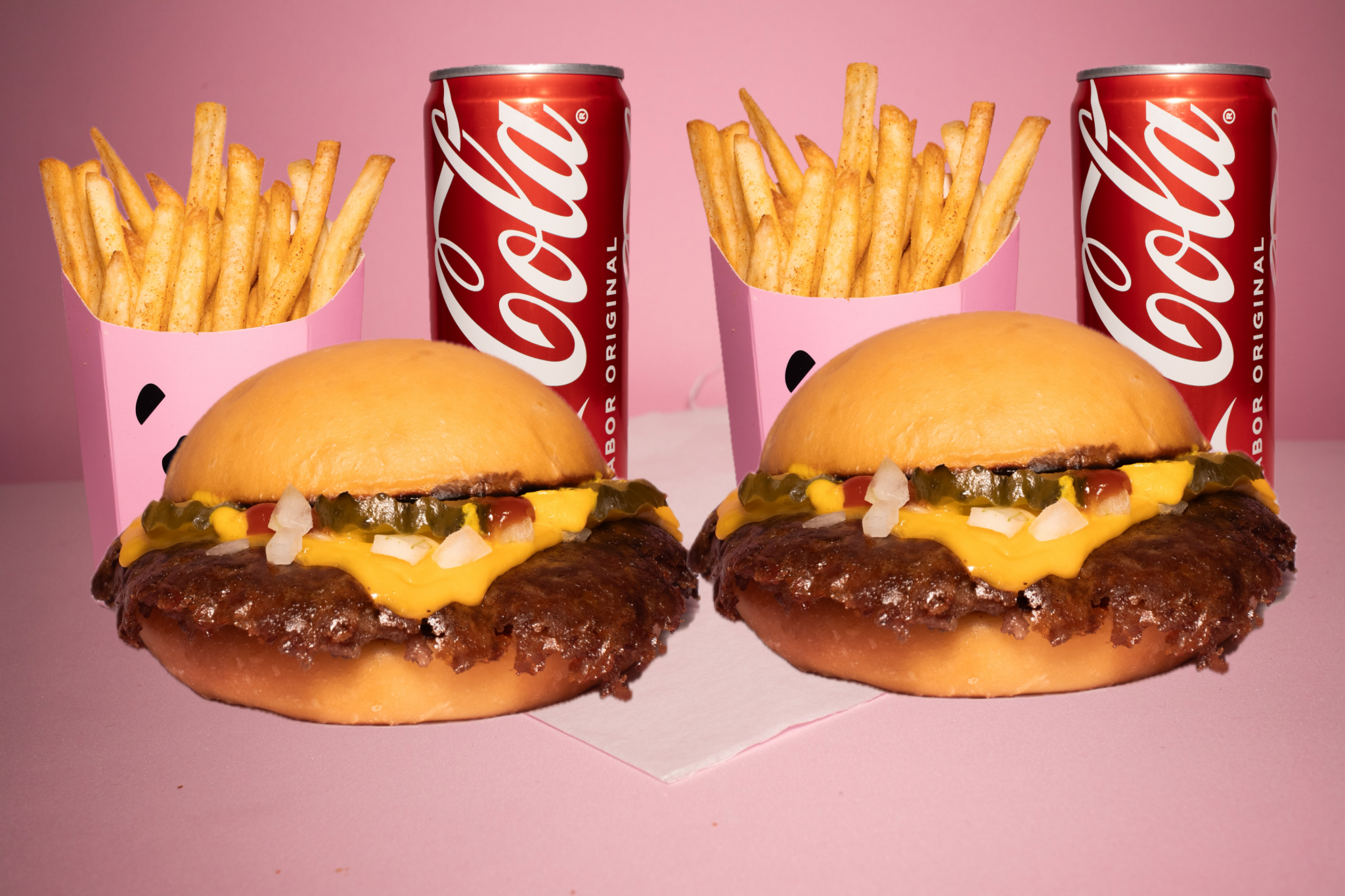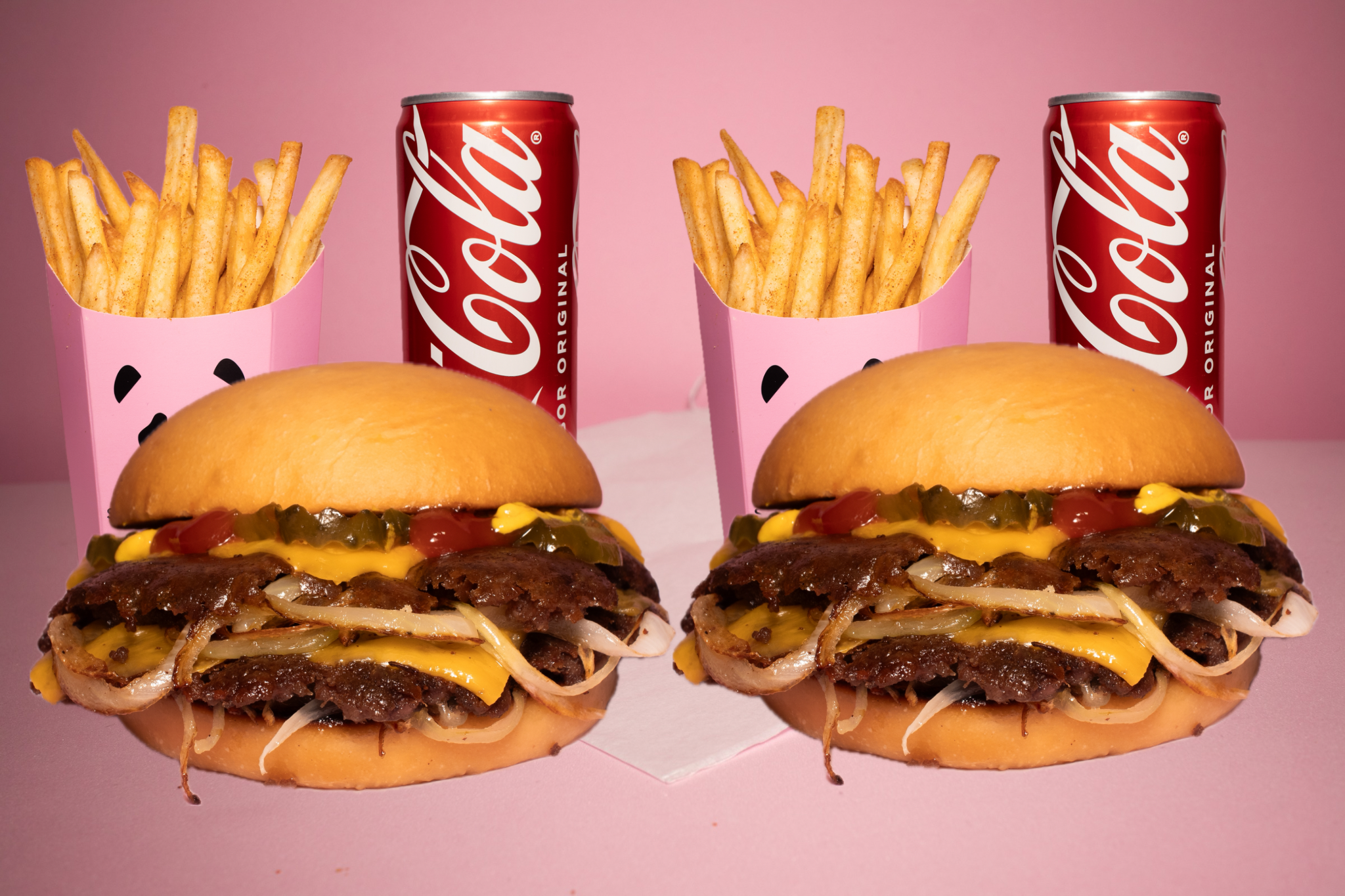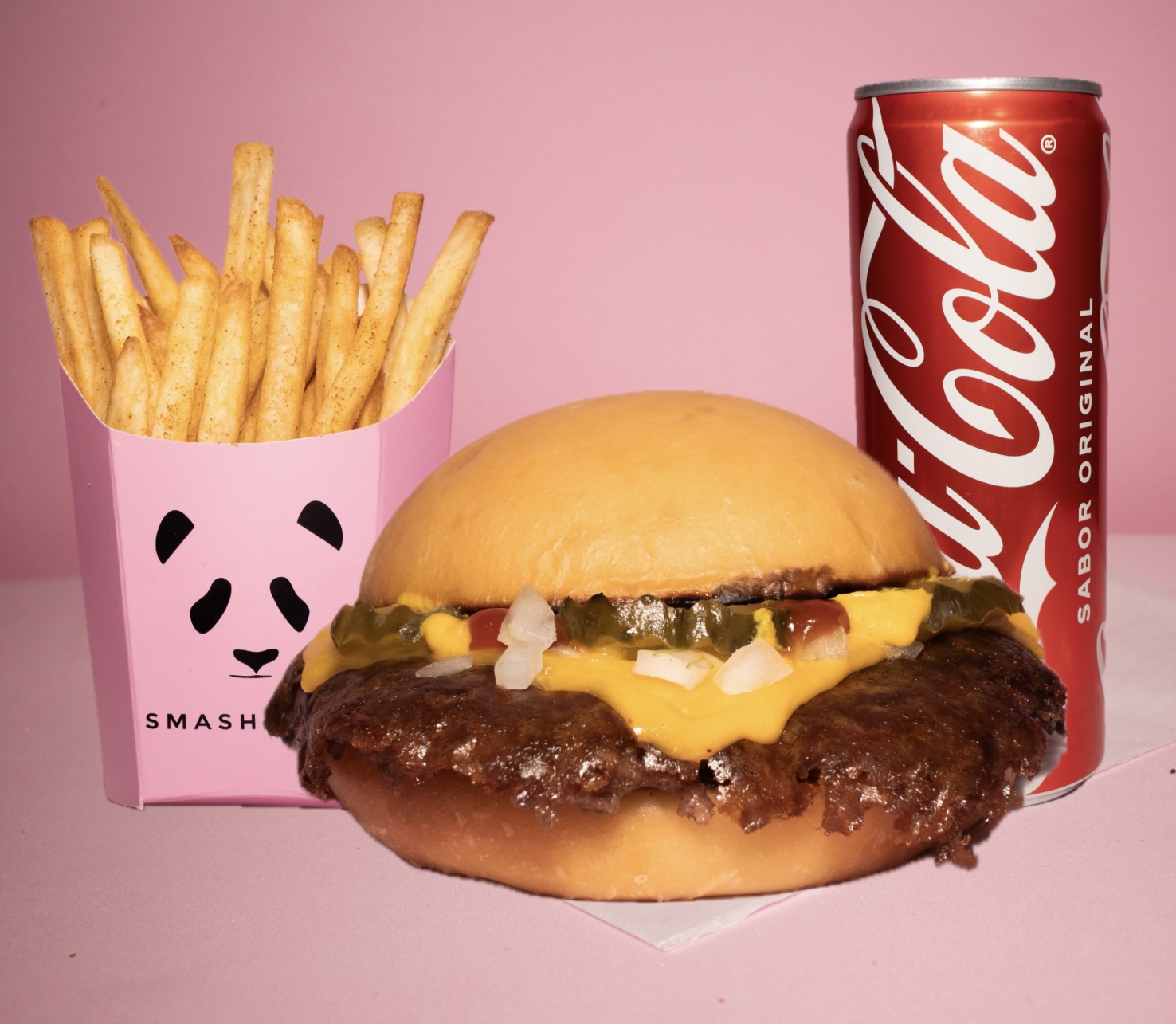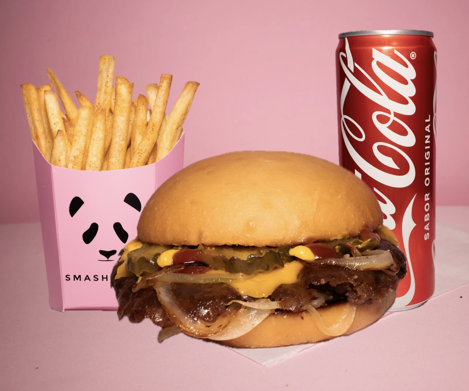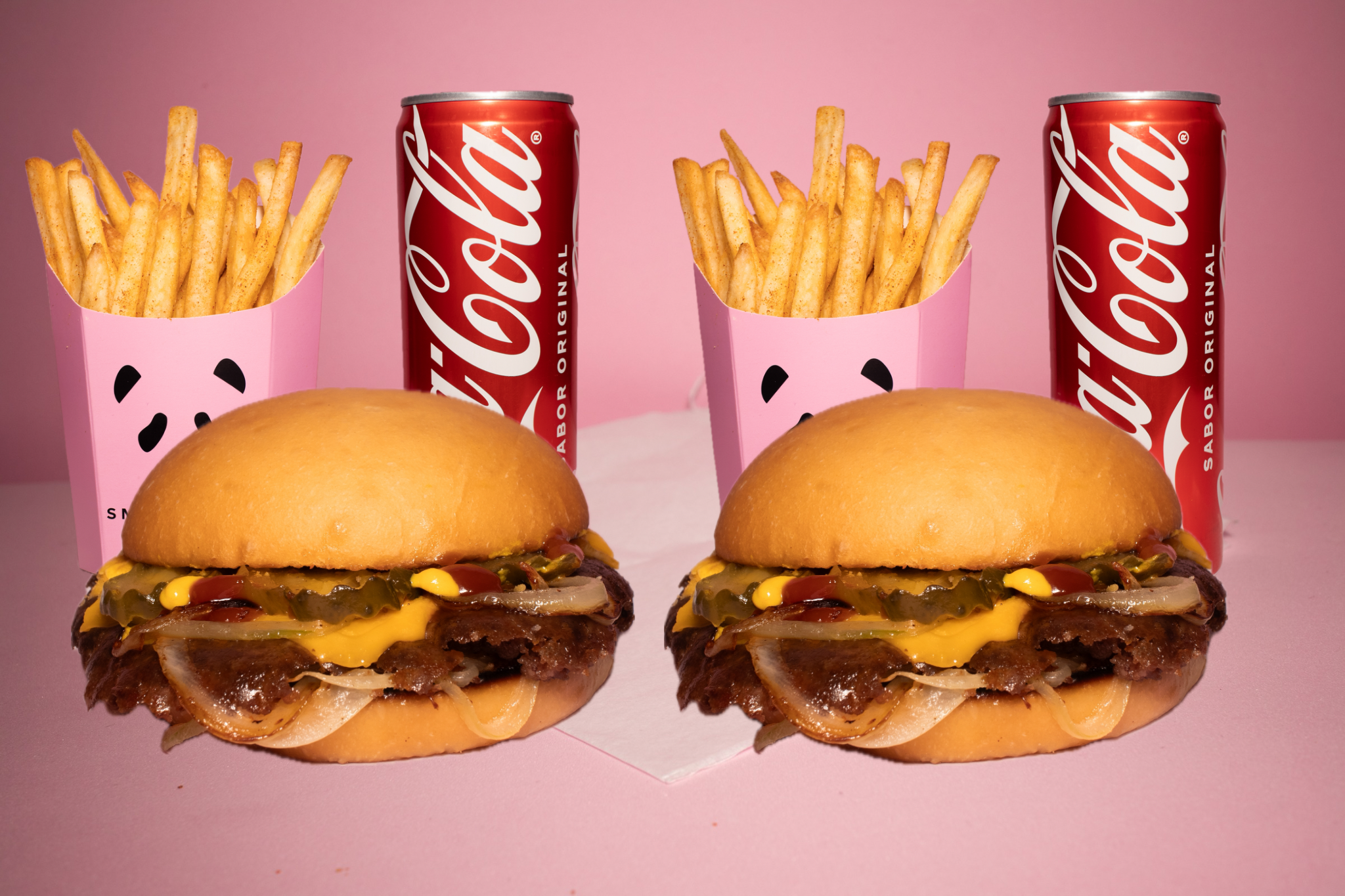 Carne 100 % de res smashiada con tiras de cebolla, pan de papa artesanal recién horneado, queso americano, pepinillos artesanales, mayonesa, cátsup y mostaza, 2 papas más 2 sodas.