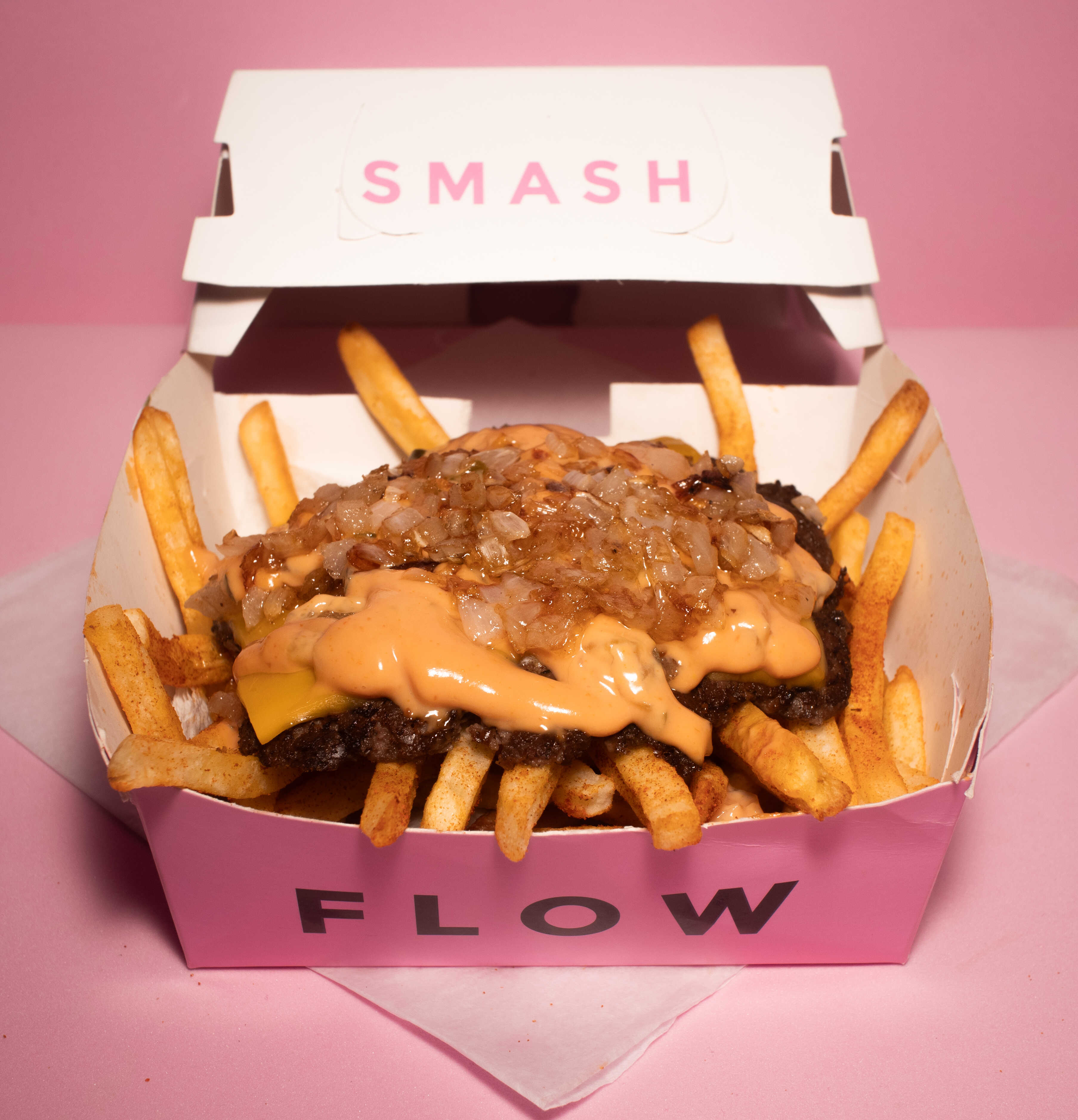 Carne 100 % de res smashiada con tiras de cebolla, pan de papa artesanal recién horneado, queso americano, pepinillos artesanales, mayonesa, cátsup y mostaza.