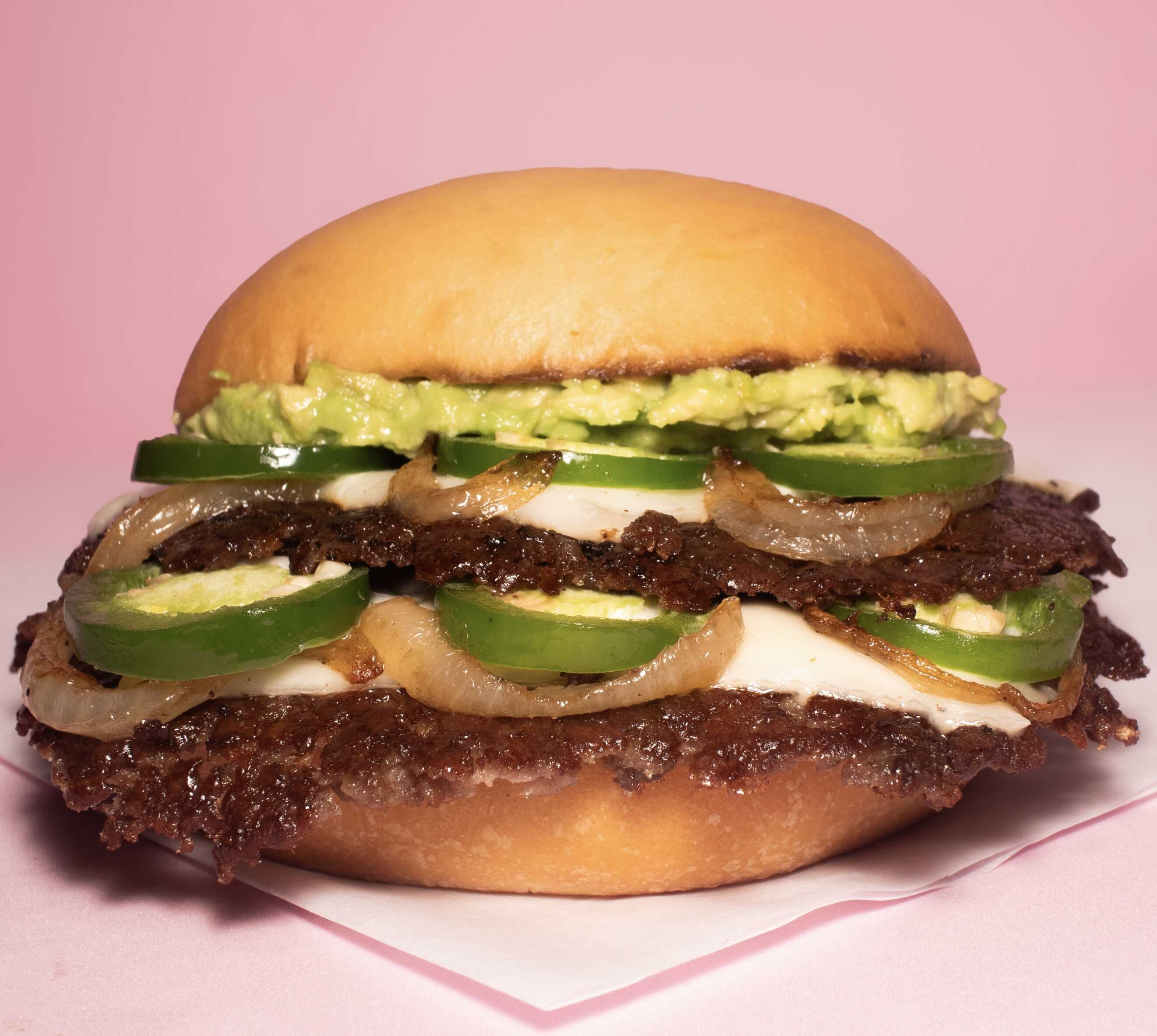 Doble carne 100 % de res smashiada con tiras de cebolla y chile jalapeño, pan de papa artesanal recién horneado, queso suizo, guacamole y mayonesa.