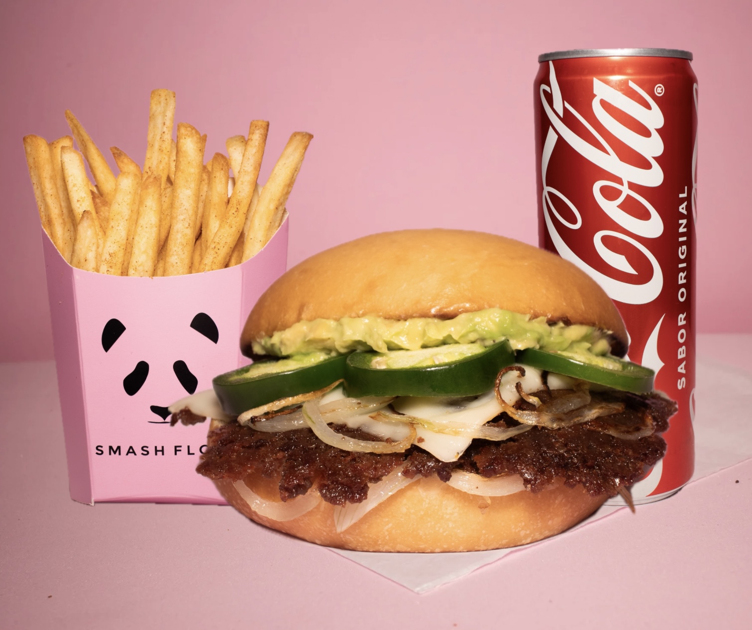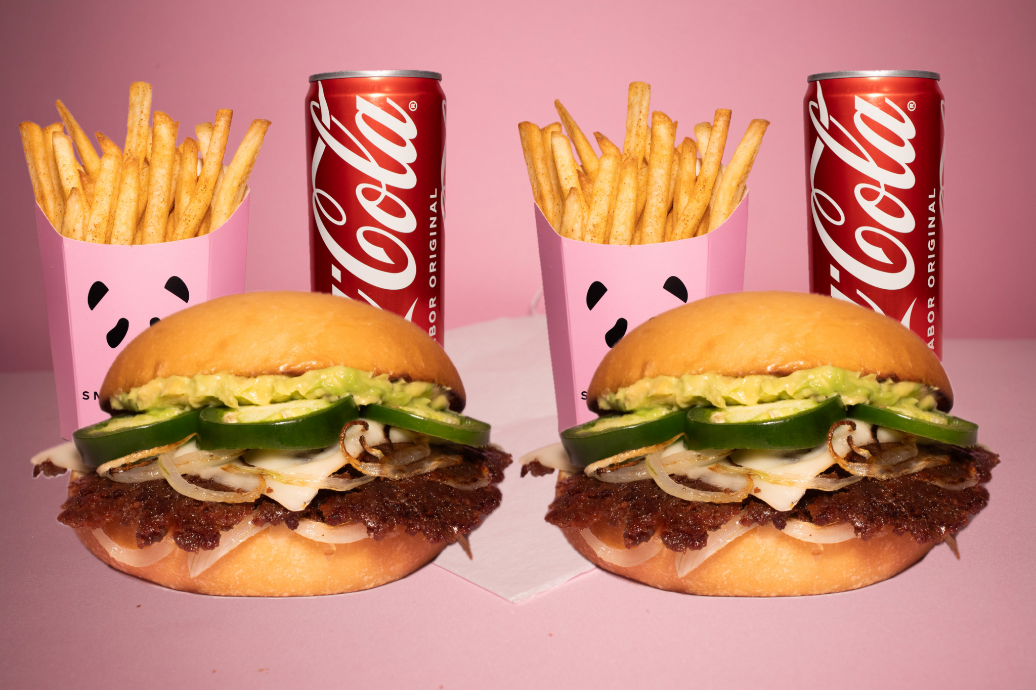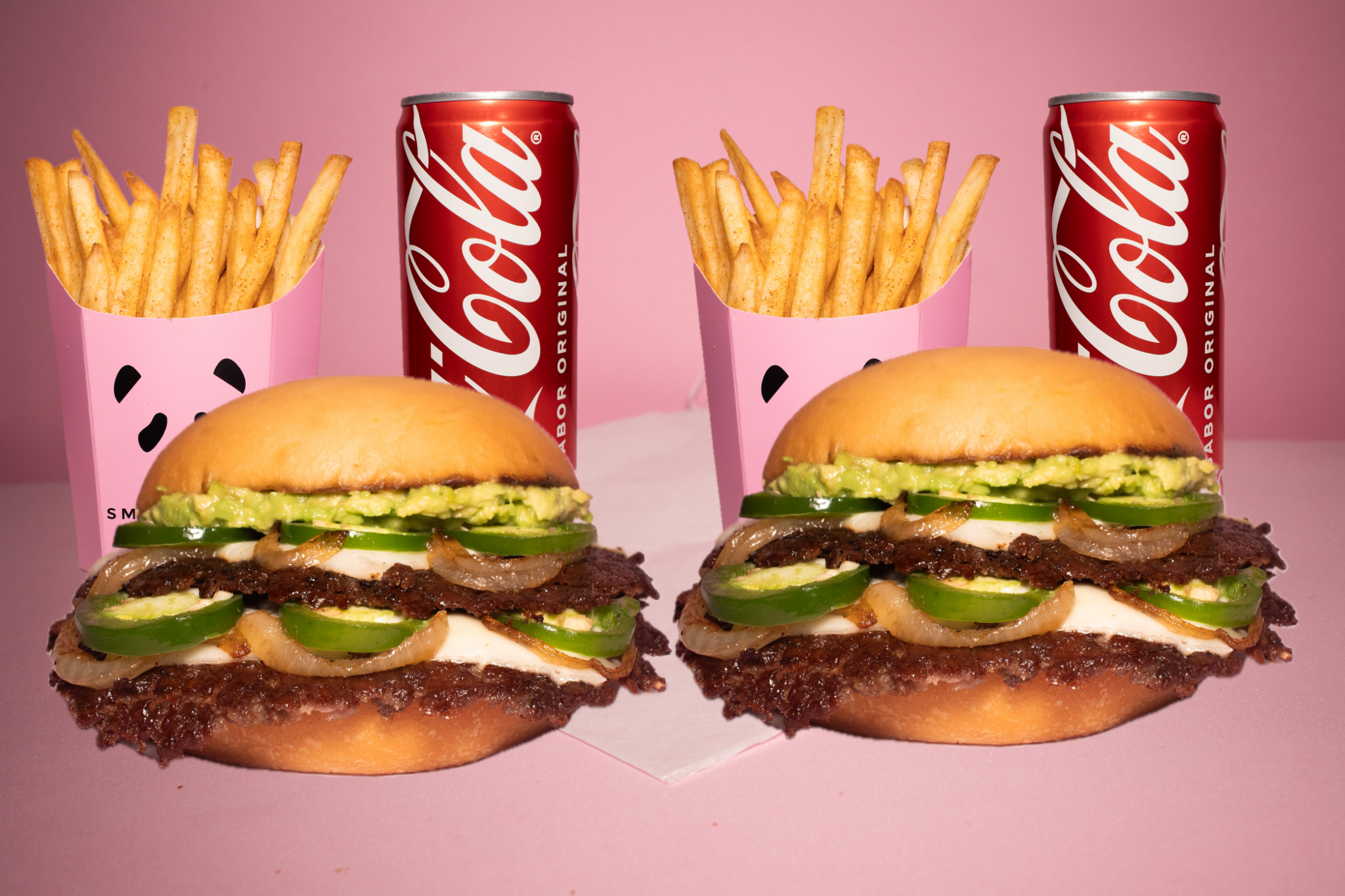 Carne 100 % de res smashiada con tiras de cebolla y chile jalapeño, pan de papa artesanal recién horneado, queso suizo, guacamole y mayonesa, 2 papas más 2 sodas.