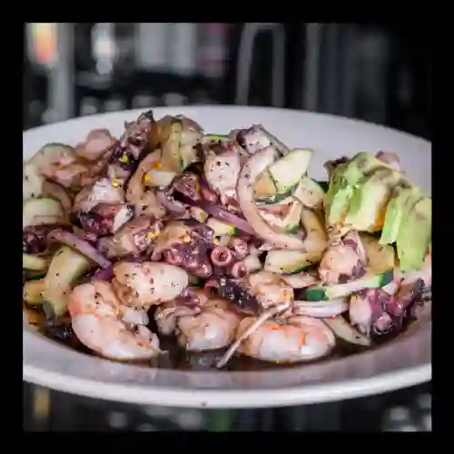 Pulpo, salsa bandera, tomate cebolla cilantro, calabacita italiana y zanahoria, aguacate y salsas de la casa.