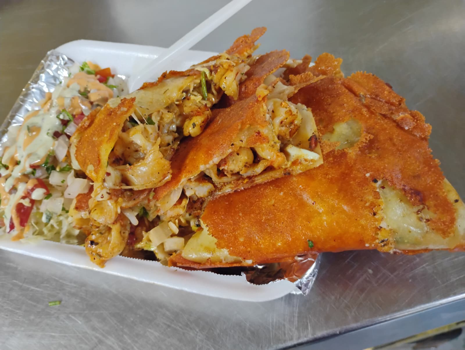 Taco con pechuga de pollo, carne de res, camarones, costra de queso, repollo, salsa bandera, limón y aderezos de la casa.