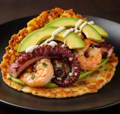 Taco con pulpo, camarones, marlin, y calamar, costra de queso, repollo, salsa bandera, limón y aderezos de la casa.