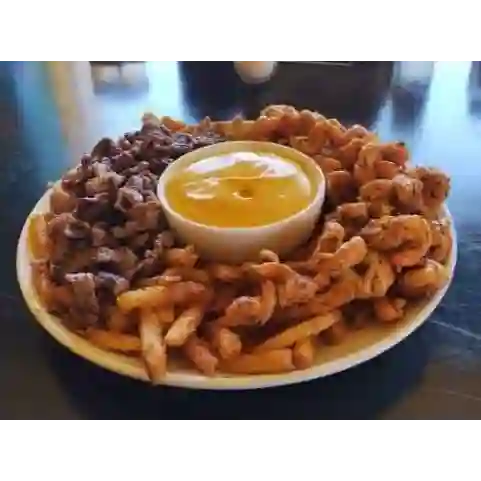 Rallys fries, sazonadas y crujientes, papas originales de las rallys, de asada y camarón, queso cheddar, incluye aderezos.