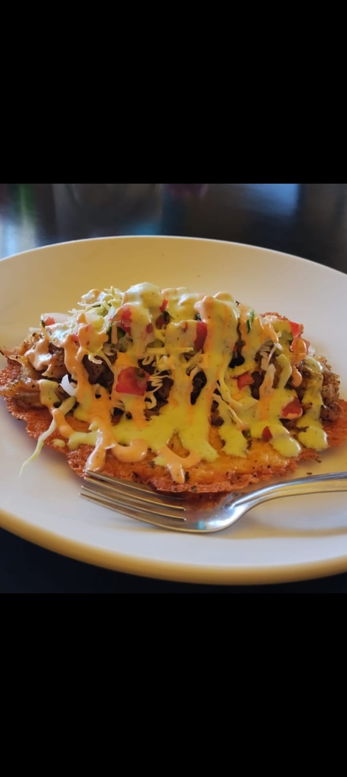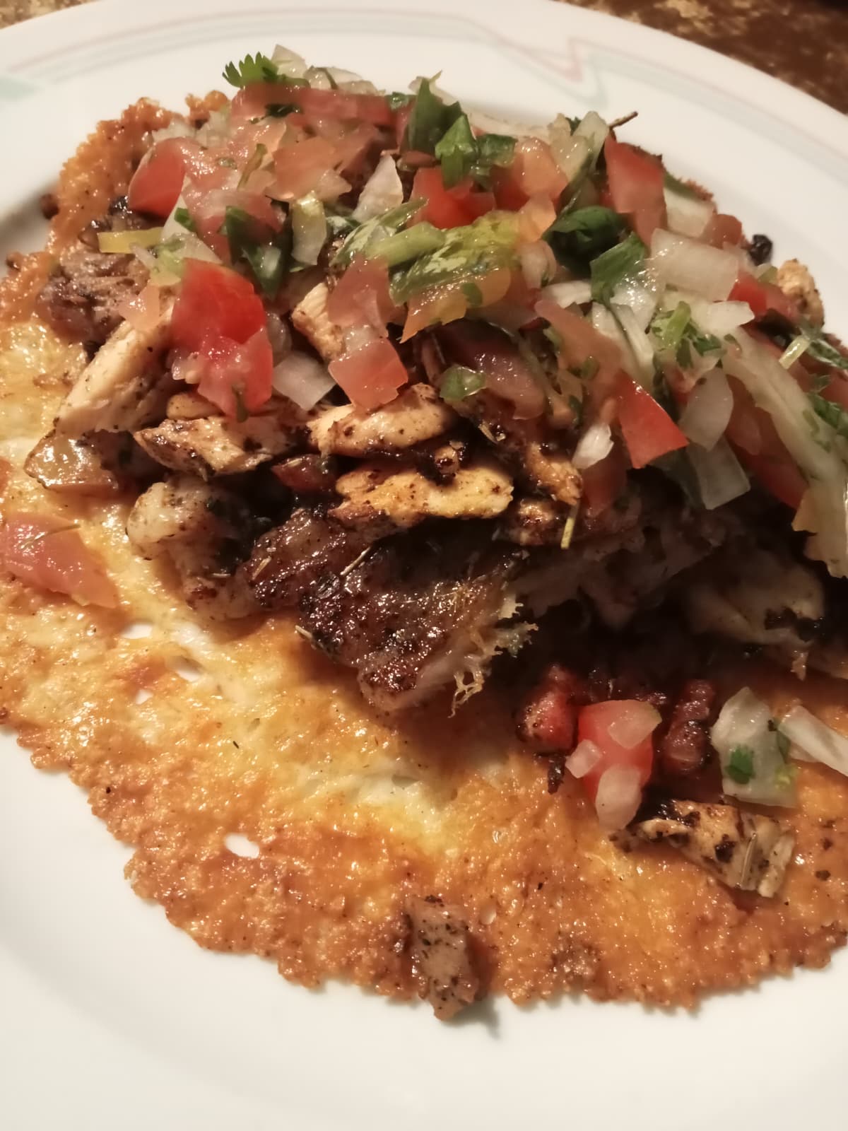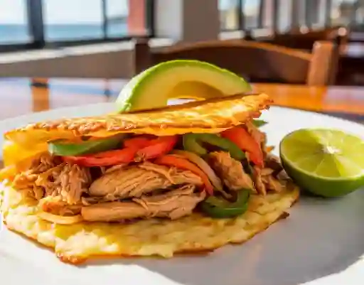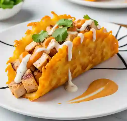 Taco con pechuga de pollo a la plancha, costra de queso, repollo, salsa bandera, limón y aderezos de la casa.