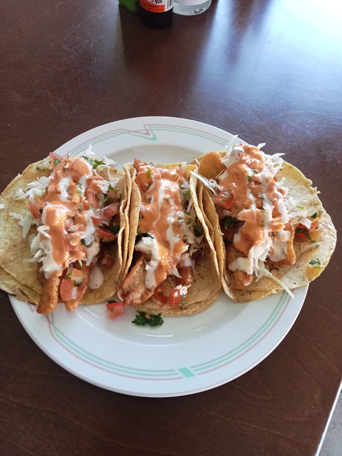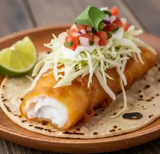 Flautas de pescado 4 pzas, repollo, salsa bandera, aguacate y aderezos, salsa de la casa 4 pzas, repollo, salsa bandera, aguacate y aderezos, salsa de la casa.