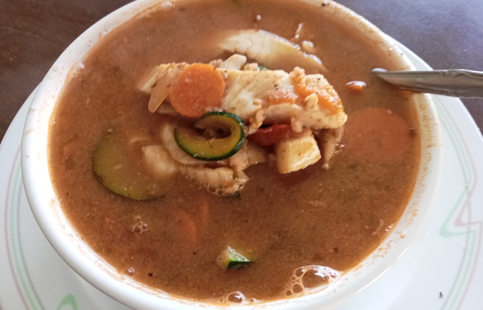 Pescado, tomate cebolla cilantro, calabacita italiana y zanahoria, aguacate y salsas de la casa.