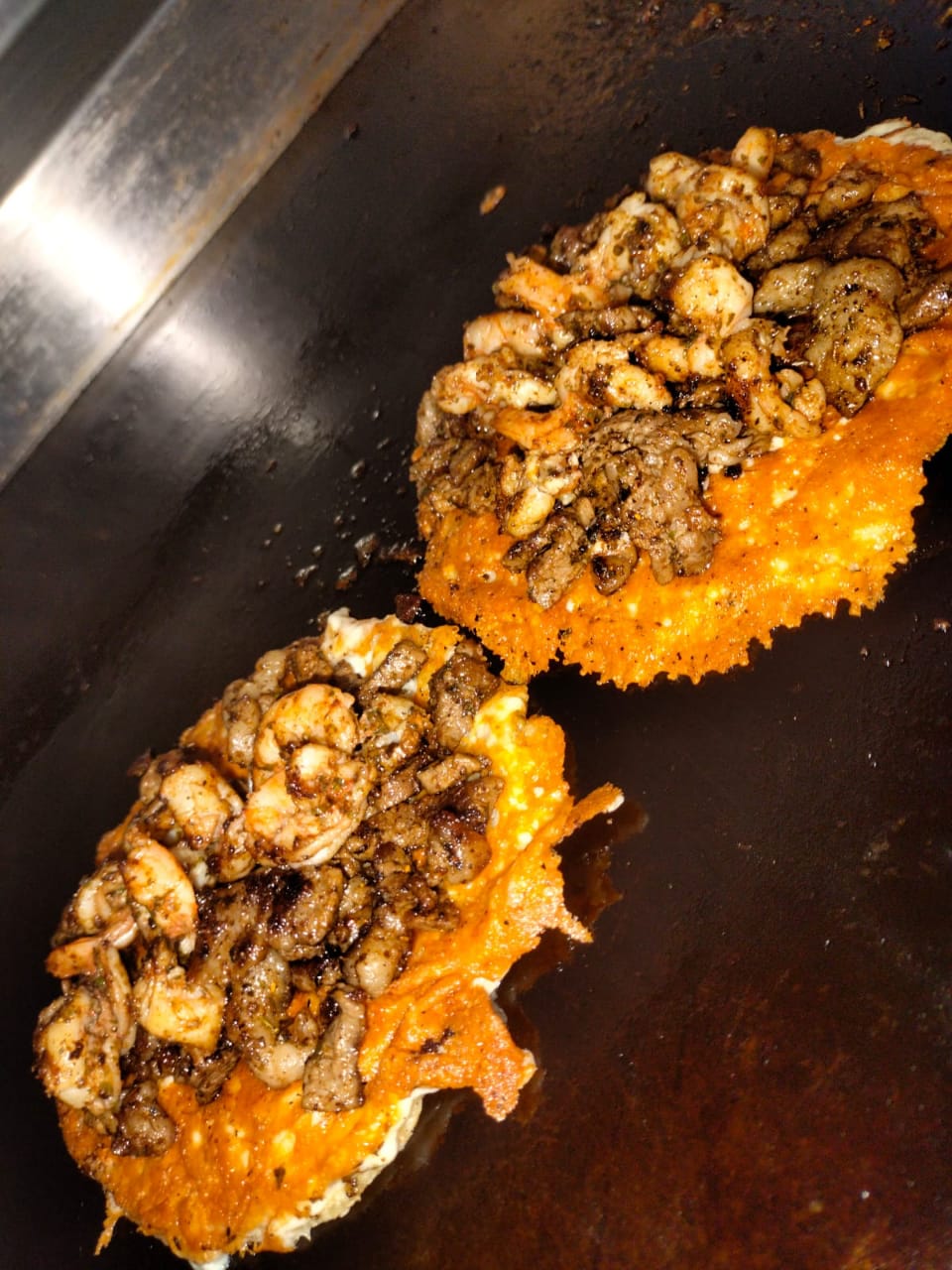 Taco con camarones, carne de res, costra de queso, repollo, salsa bandera, limón y aderezos de la casa.