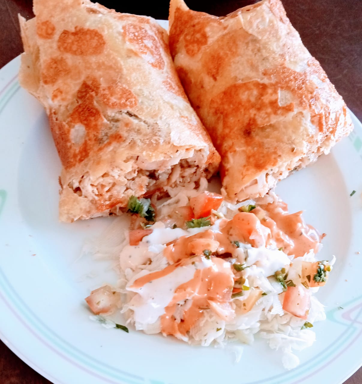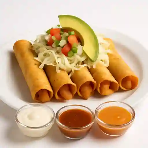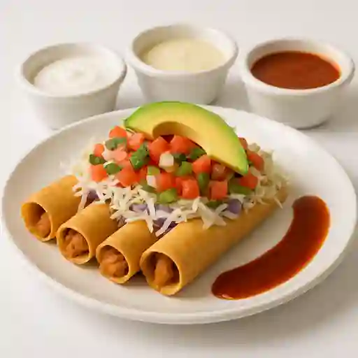 Flautas de camarón 4 pzas, repollo, salsa bandera, aguacate y aderezos, salsa de la casa.