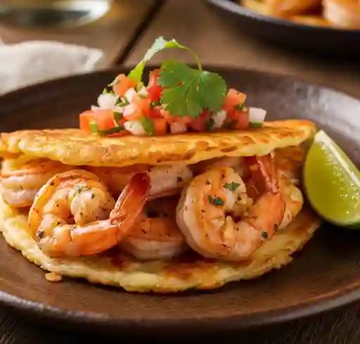 Taco con camarones, costra de queso, repollo, salsa bandera, limón y aderezos de la casa.