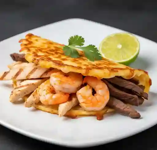 Quesadilla especial, marlín, camarón, pulpo y calamar, en tortilla de harina de 16 pulgadas, acompañado de ensaladas y aderezos.