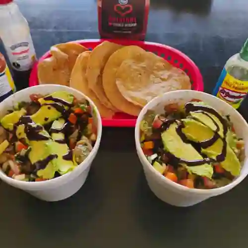 Cahuamanta, tomate cebolla cilantro, repollo, calabacita italiana y zanahoria, y salsas de la casa.