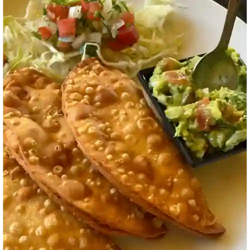 Empanadas de camarón 3 pzas rellenas de queso, acompañadas de ensaladas, aguacate y aderezos.
