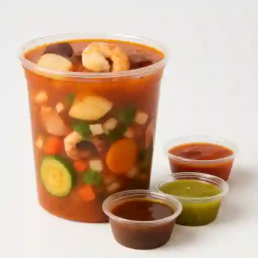 Camarón, pulpo, salsa bandera, tomate cebolla cilantro, calabacita italiana y zanahoria, aguacate y salsas de la casa.