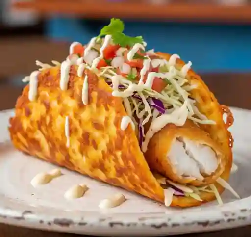 Taco con pescado, costra de queso, repollo, salsa bandera, limón y aderezos de la casa.