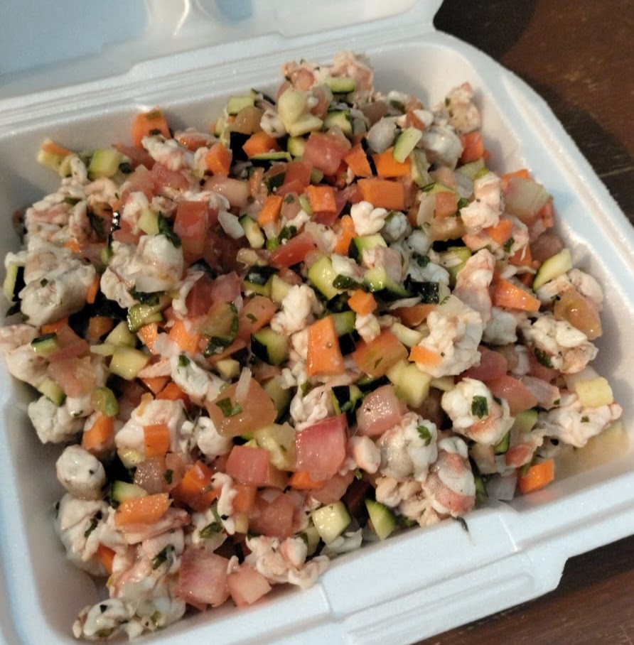 Camarón curtido, salsa bandera, tomate cebolla cilantro, calabacita italiana y zanahoria.