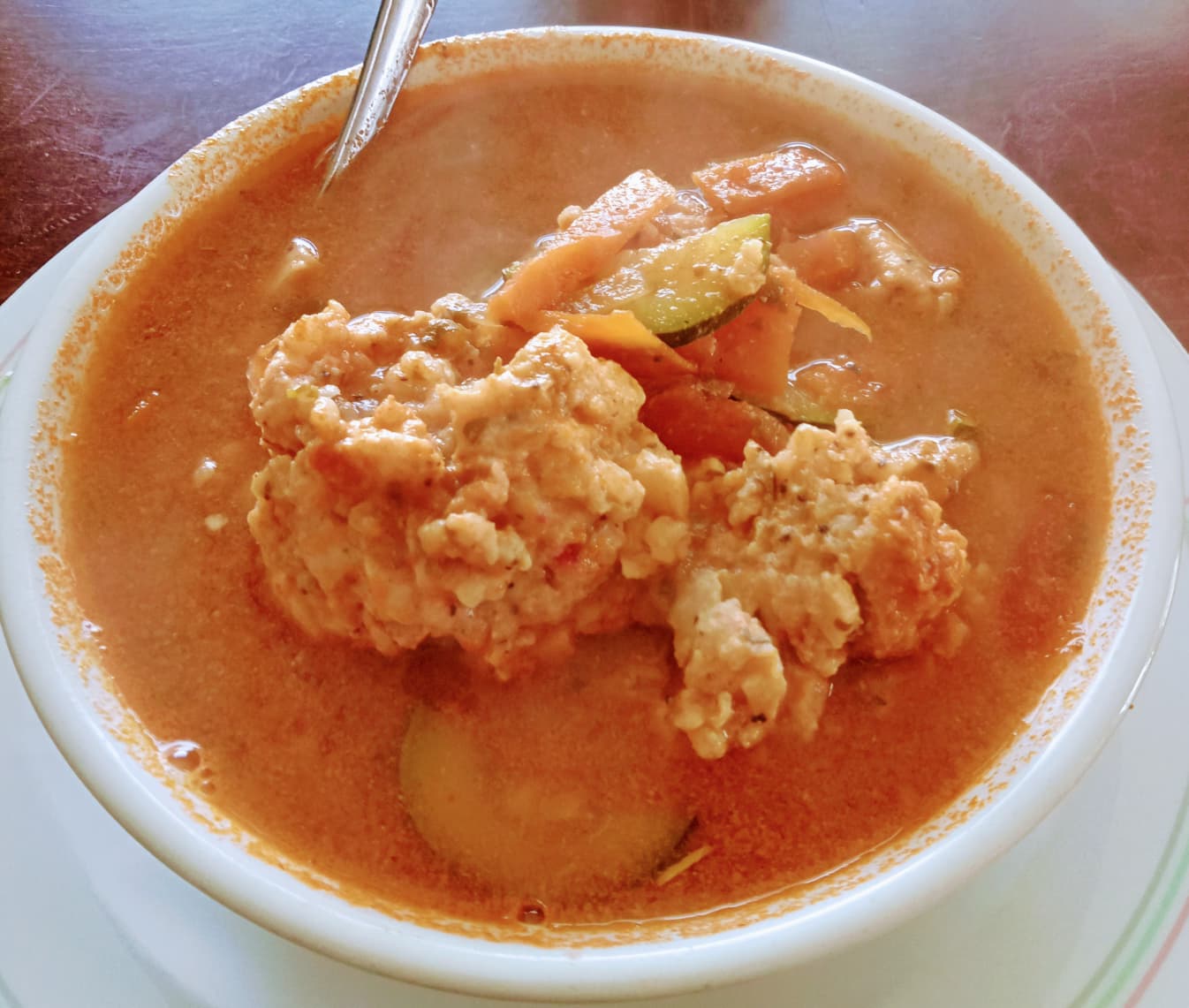 Albóndigas de camarón, 4 pzas, tomate cebolla cilantro, calabacita italiana y zanahoria, aguacate y salsas de la casa.