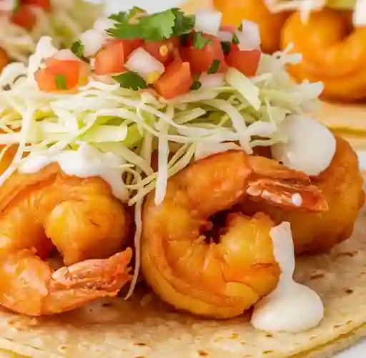 Taco de tortilla de maíz con camarón capeado, repollo, salsa bandera, limón y aderezos de la casa.