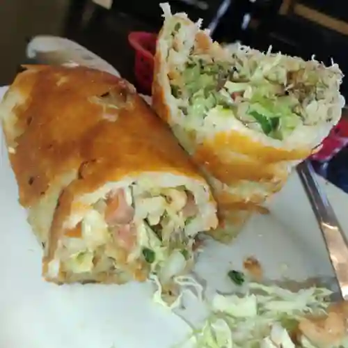 Burro de preparación a elegir con pechuga de pollo, carne de res, camarones en tortilla de harina de 16´´ y costra de queso salsas y aderezos