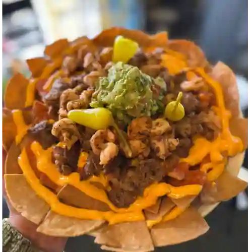 Nachos con camaron y asada, frijoles puercos, queso cheddar, aderezos y aguacate.