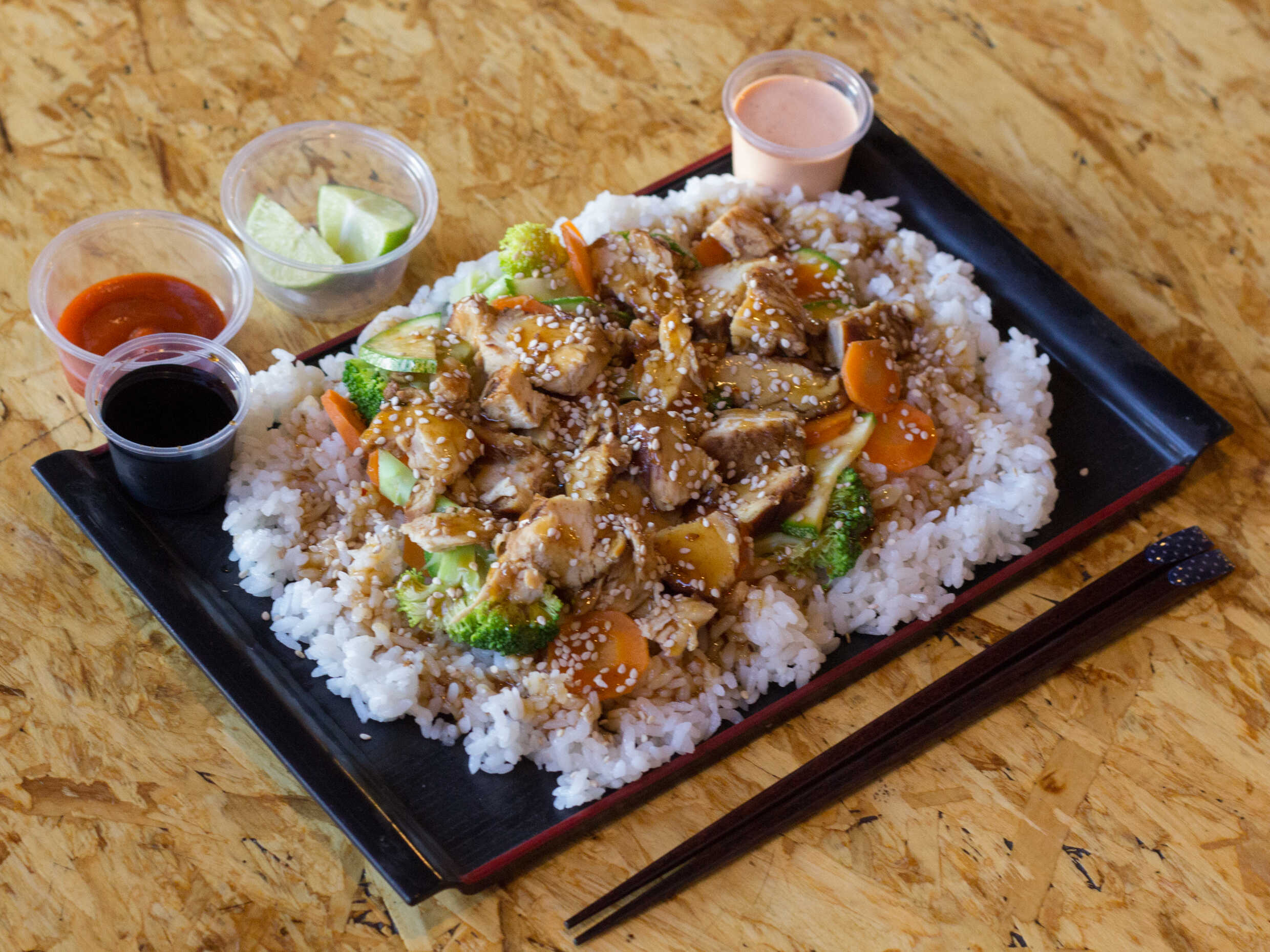 Trocitos de pollo empanizado y frito, mezclado con una salsa picante a elegir, montado sobre una cama de arroz blanco, aderezado con ajonjolí y cebollín.
