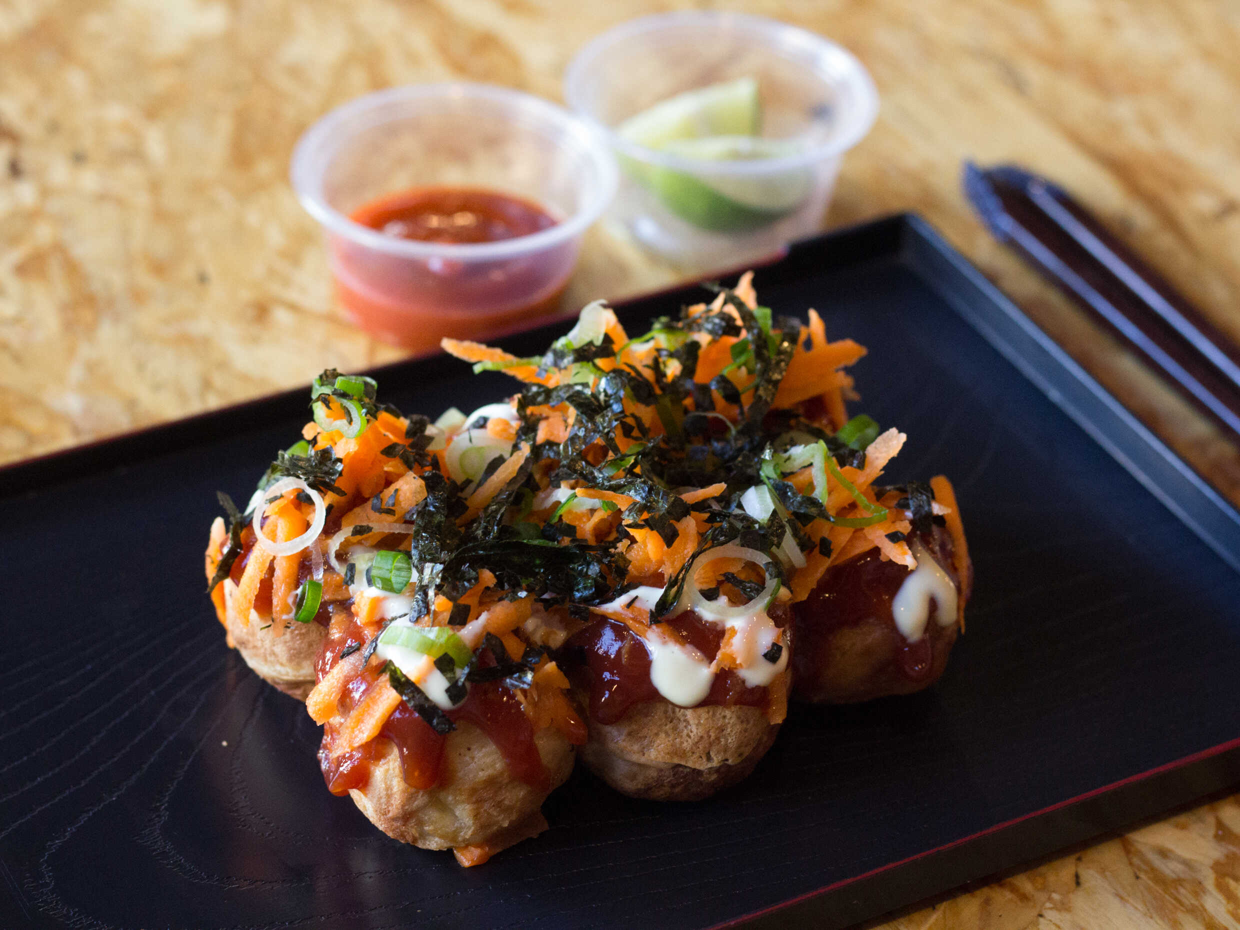 Bolitas de harina de trigo rellenos de pulpo, recubiertos con salsa y mayonesa especial, zanahoria rayada, cebollin y trocitos de alga nori