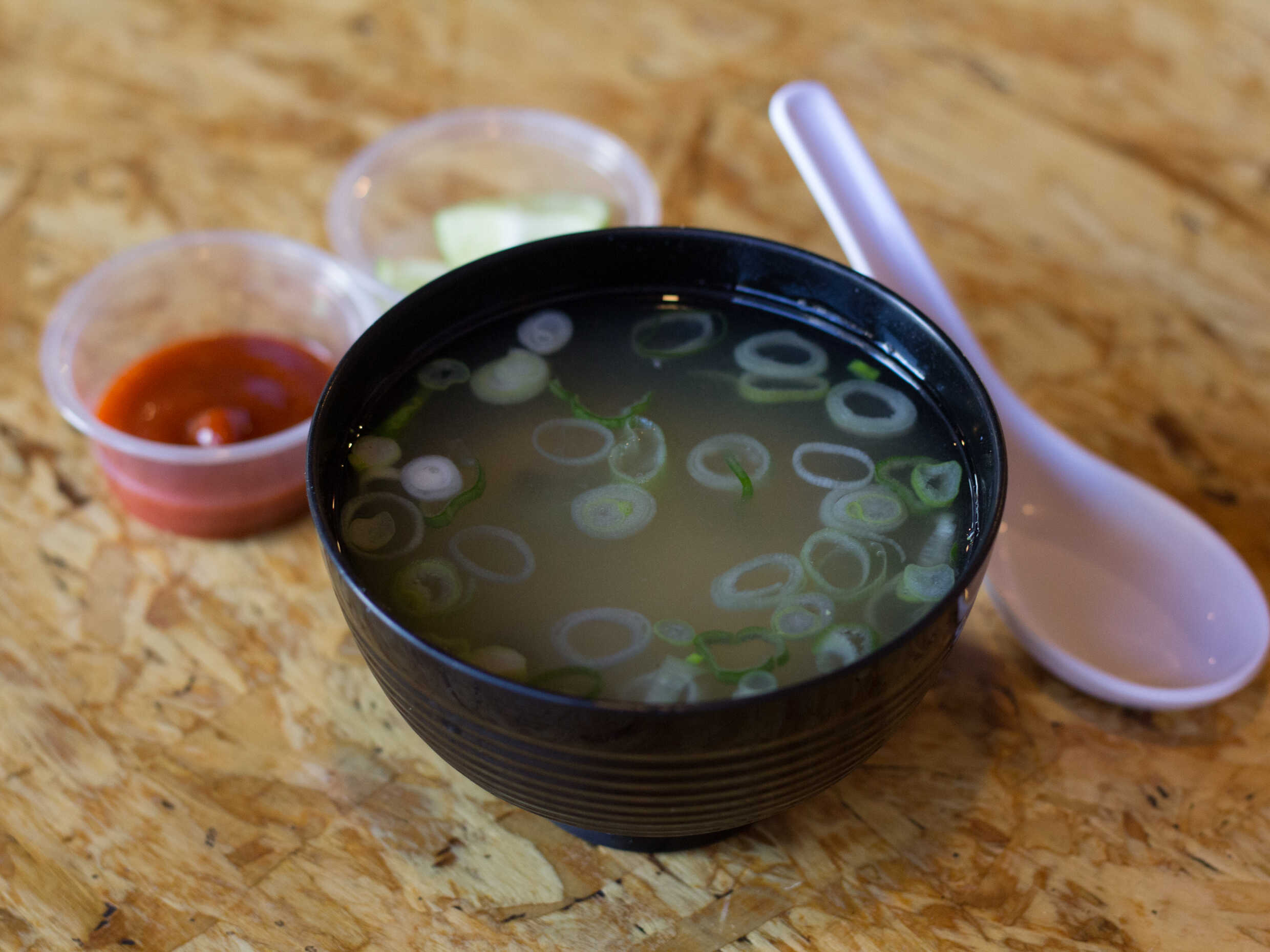Sopa a base de miso y especias, toppings huevo, cebollín, zanahoria rallada, naruto y trocitos de alga nori.