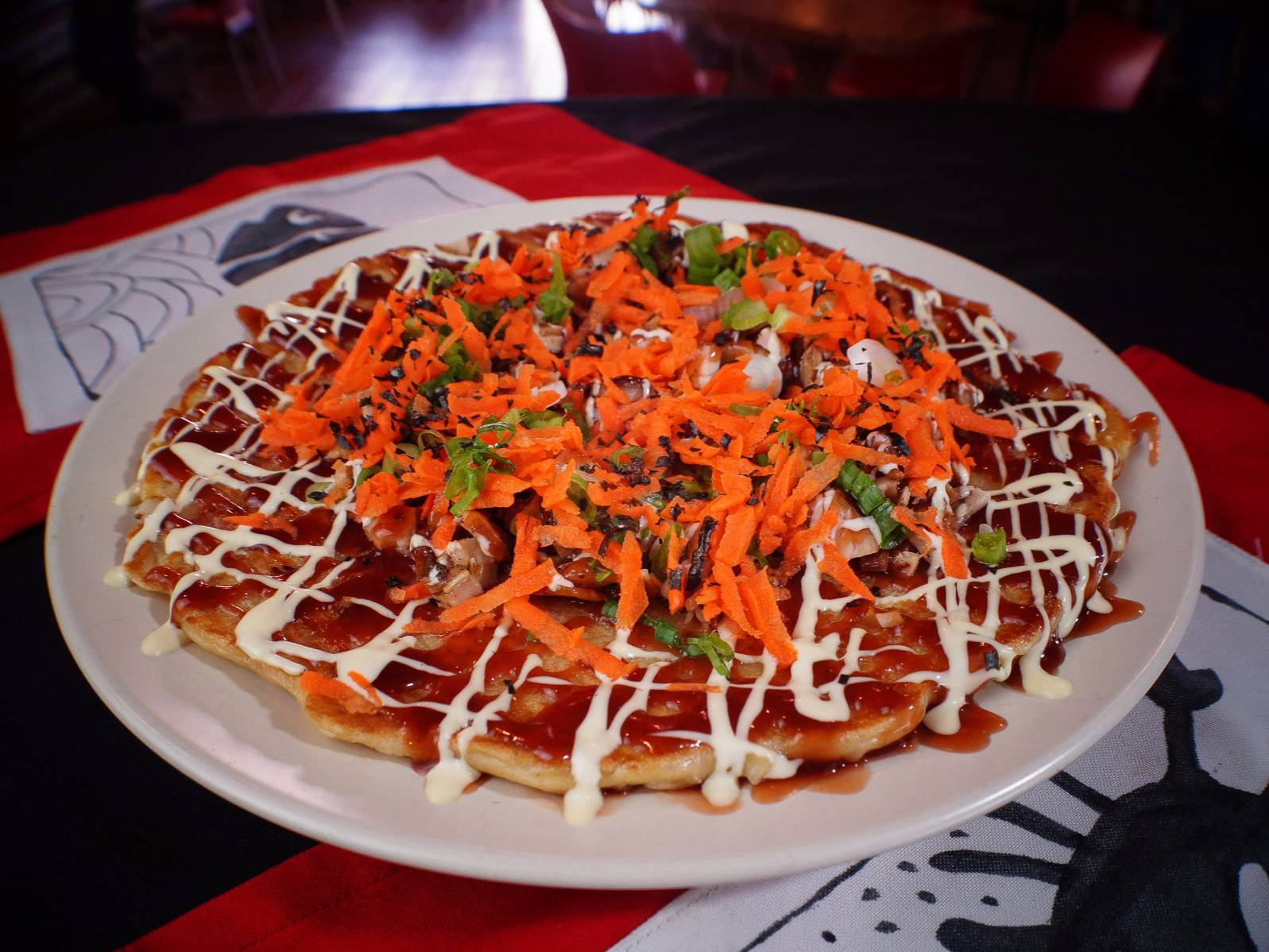 Tortilla gruesa, hecha a base de harina, repollo, huevo y papa rallada, recubierto con salsa de okonomiyaki y mayonesa de la casa, decorado con zanahoria rallada y cebollin