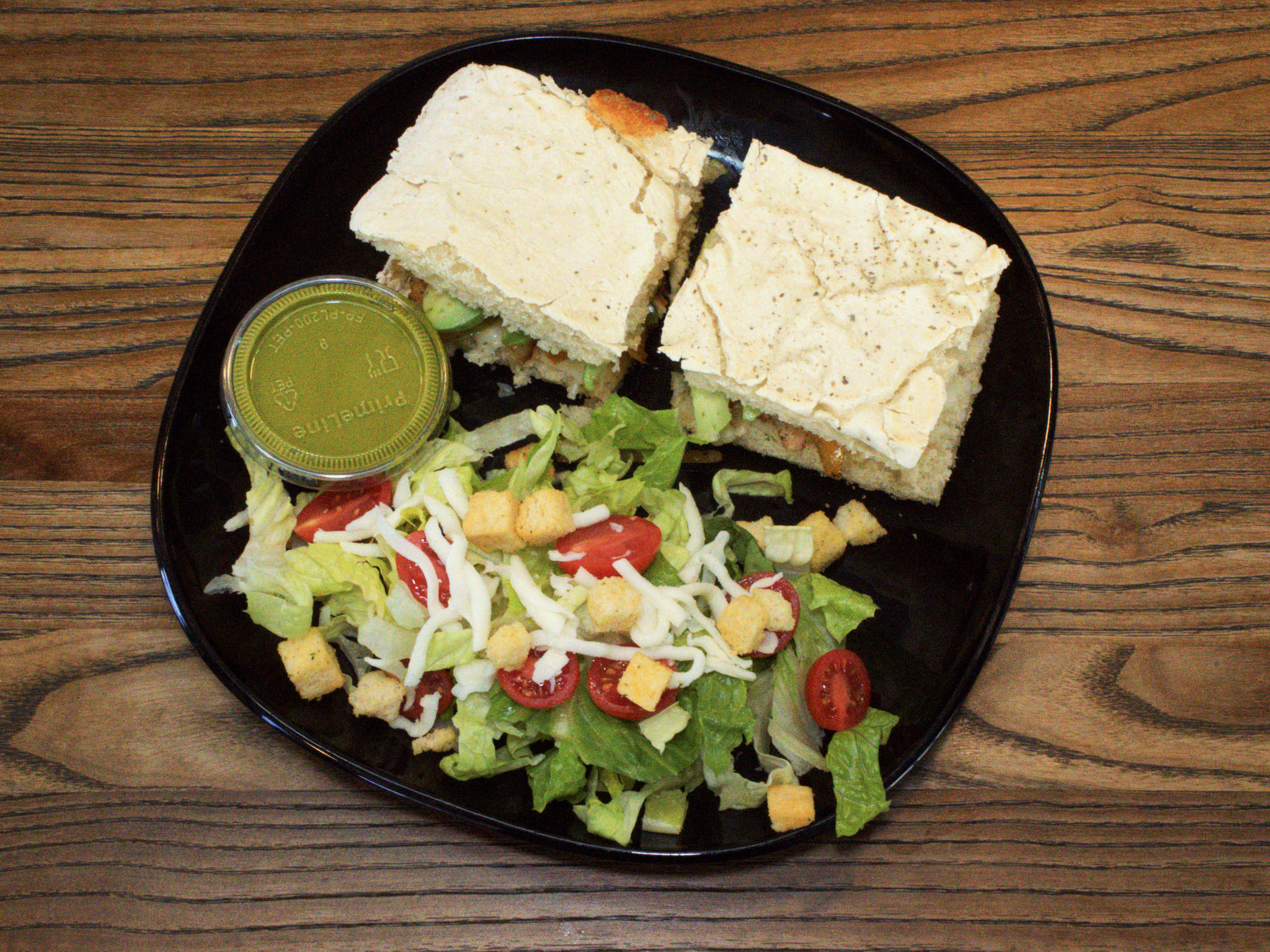 Lechuga romana, tomate cherry, aguacate, crotones, queso mozzarella y aderezo de cilantro.