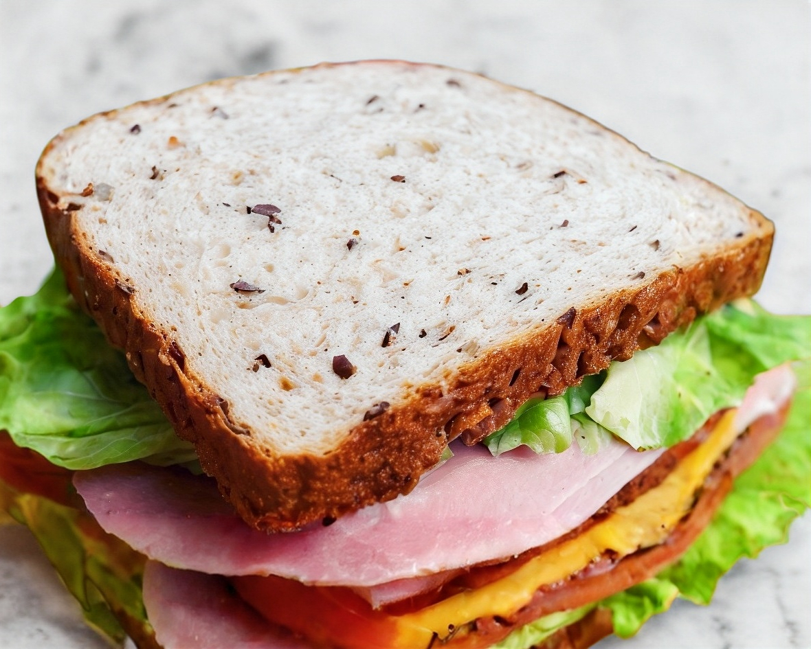 Sandwich de jamon con pan integral con linaza, queso manchego, aguacate, lechuga, tomate y espinaca.
