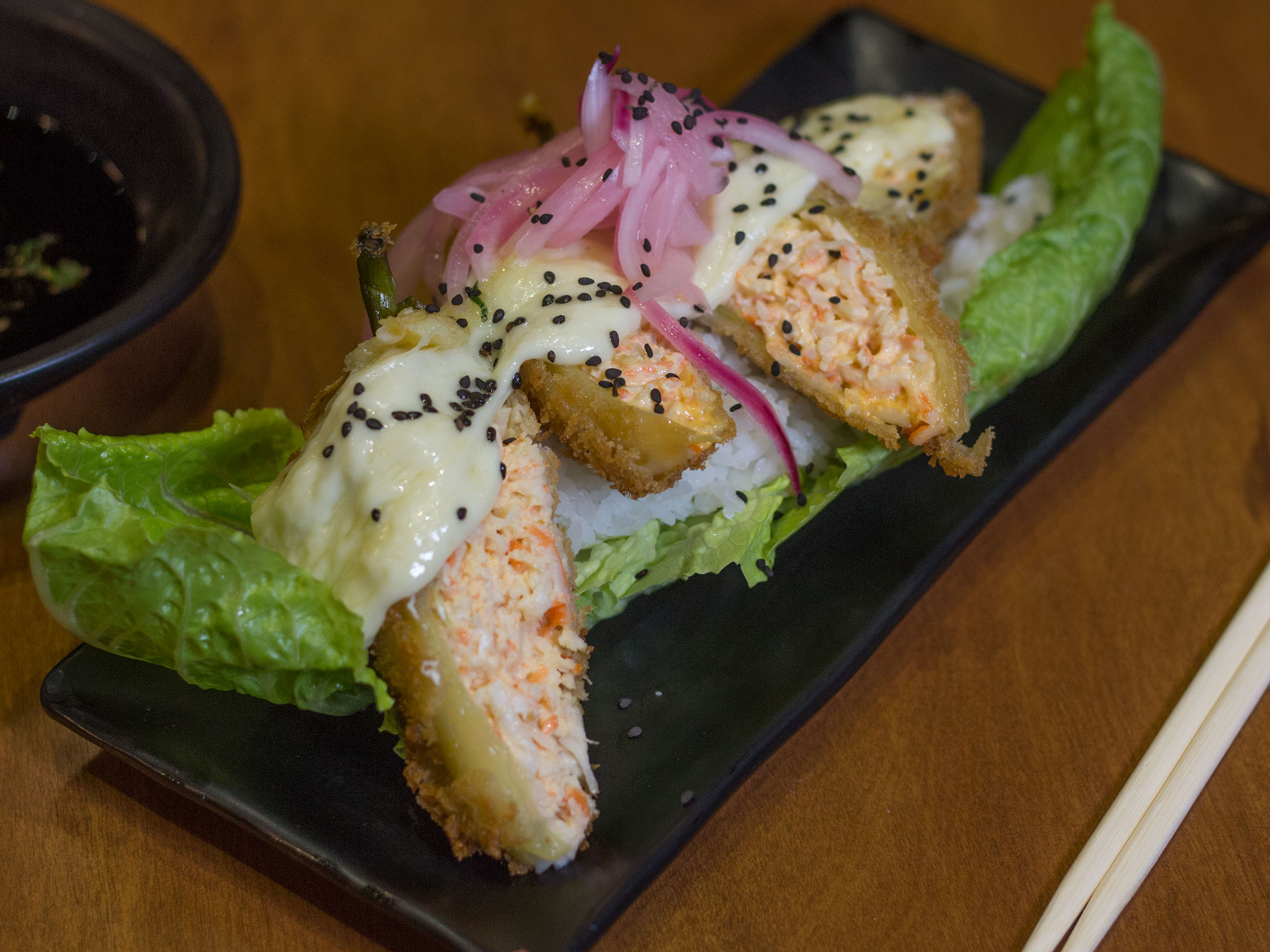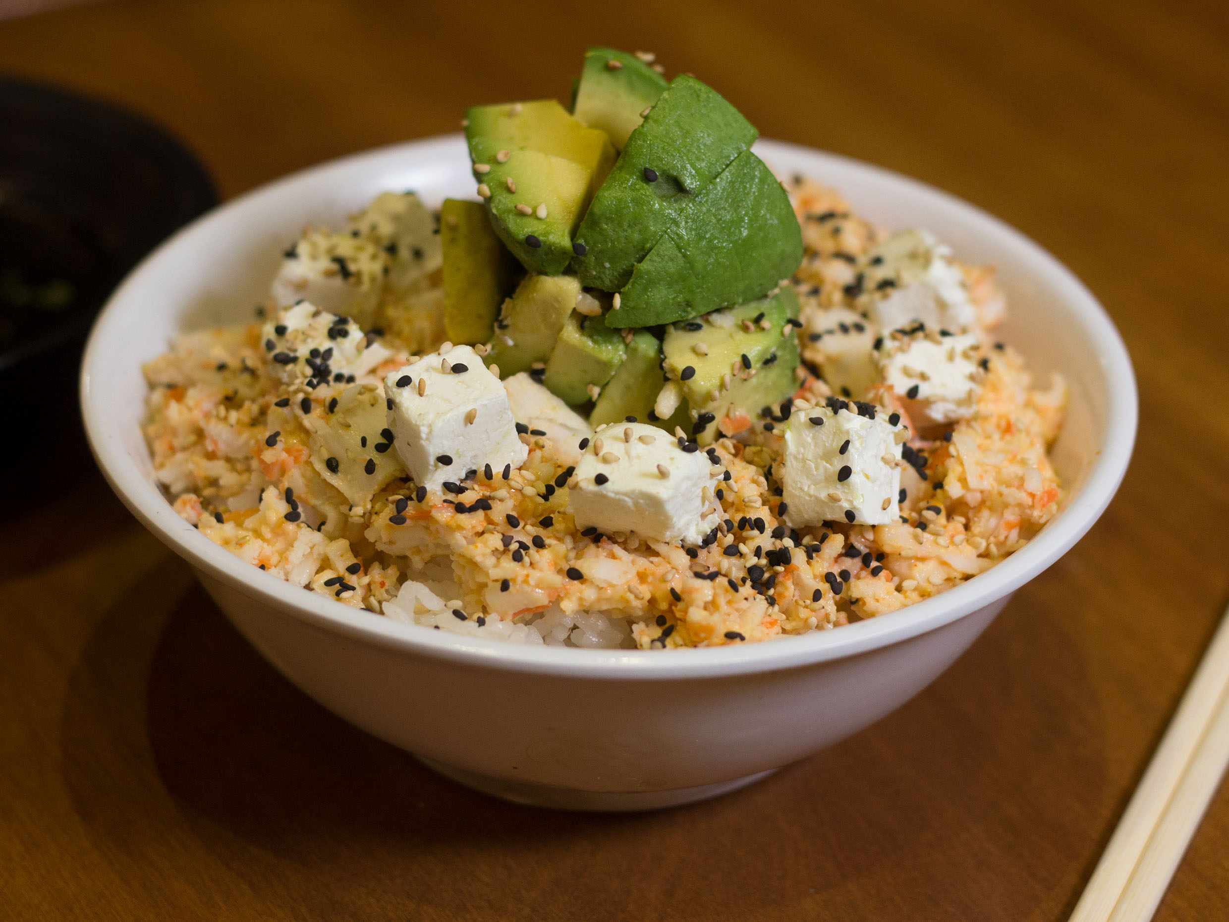Arroz frito de verduras, cangrejo, aguacate y queso crema.