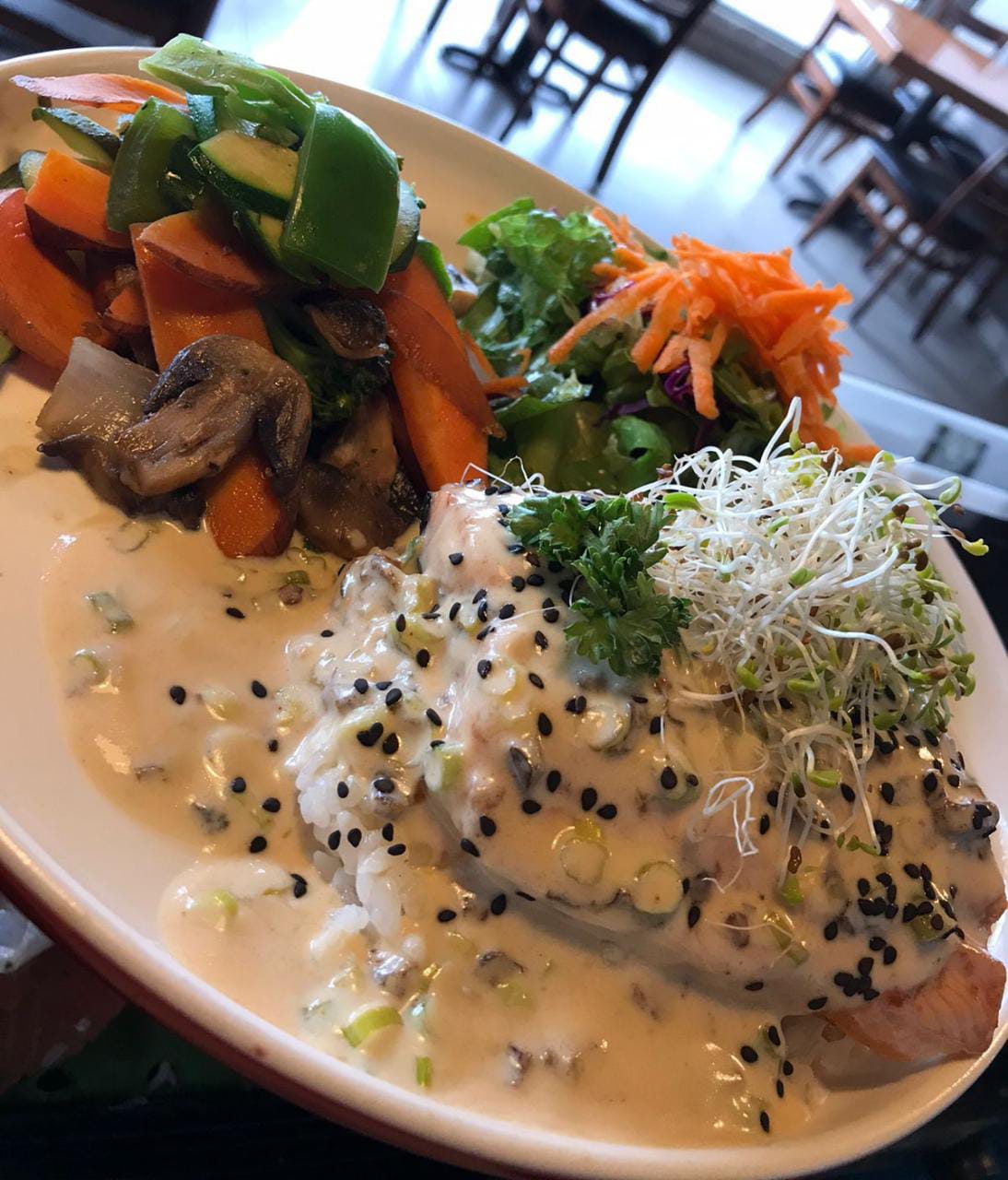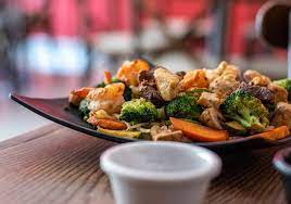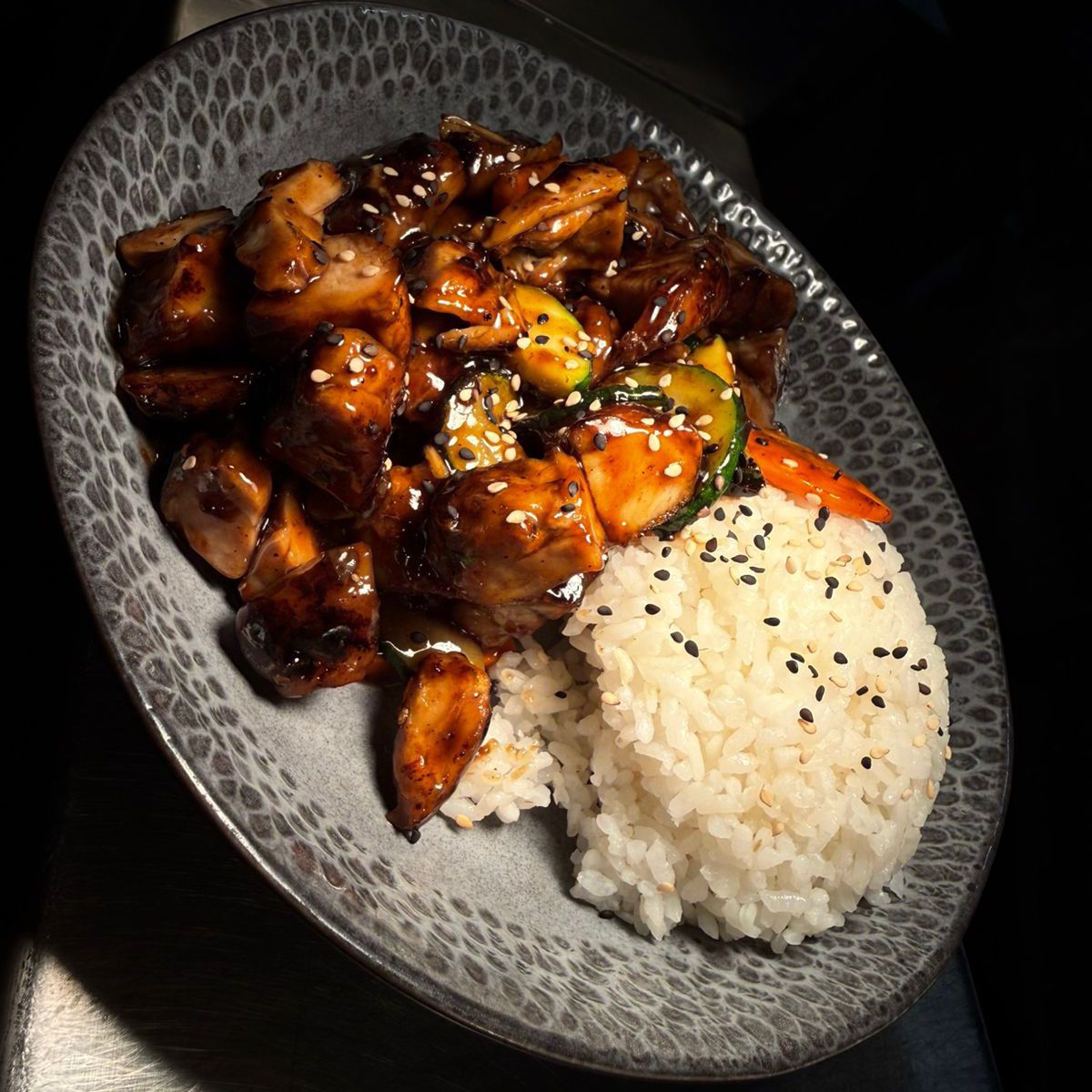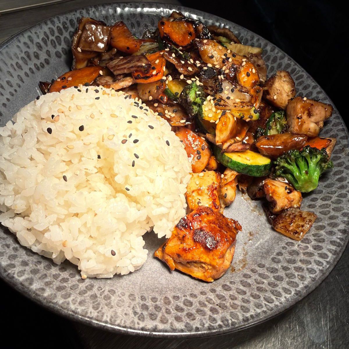 Bañado en salsa teriyaki con verduras acompañadas de arroz y ensalada.