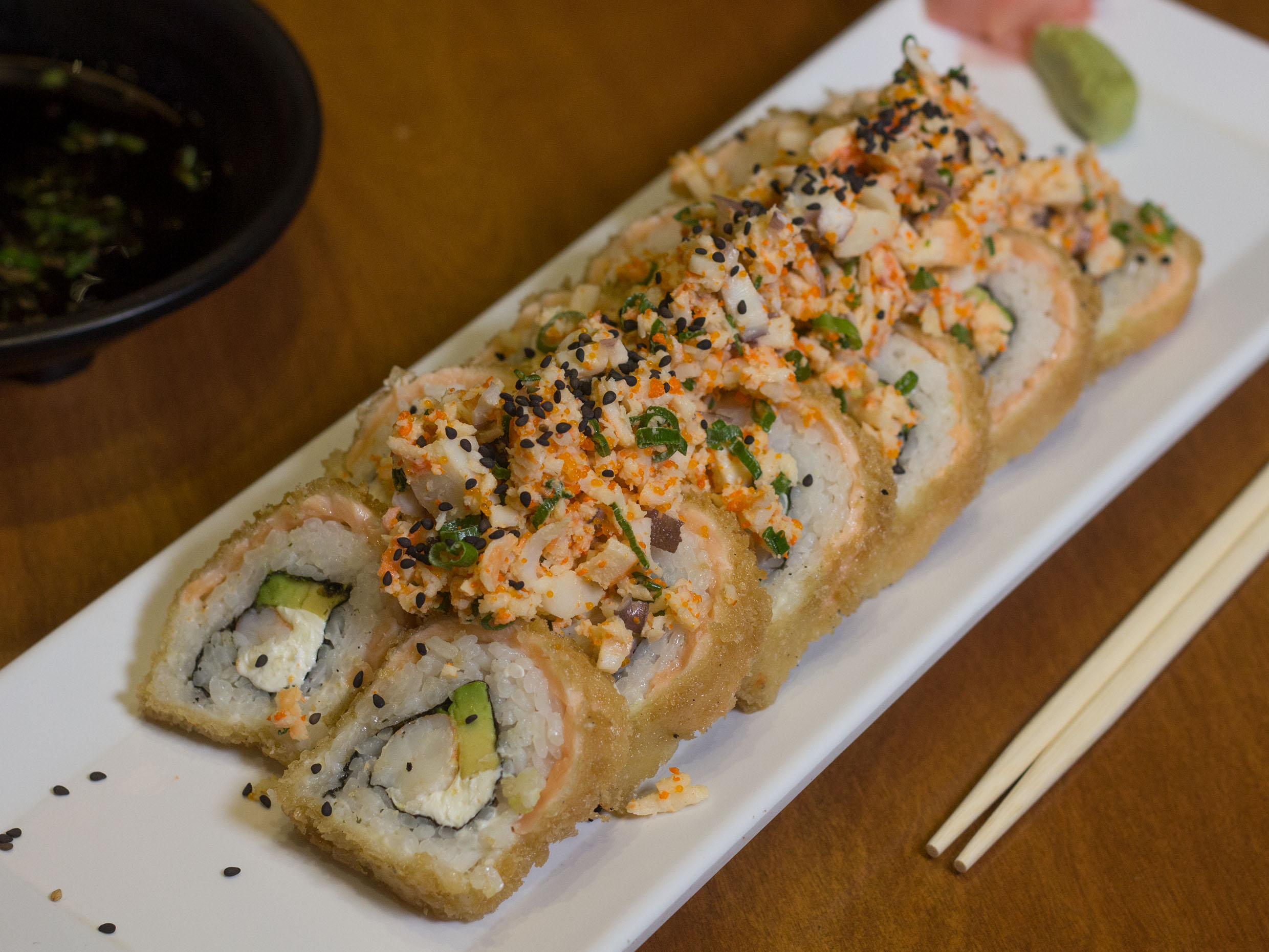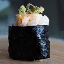 Cangrejo, aguacate, queso Philadelphia cubierto de camarón picado y masago spicy.