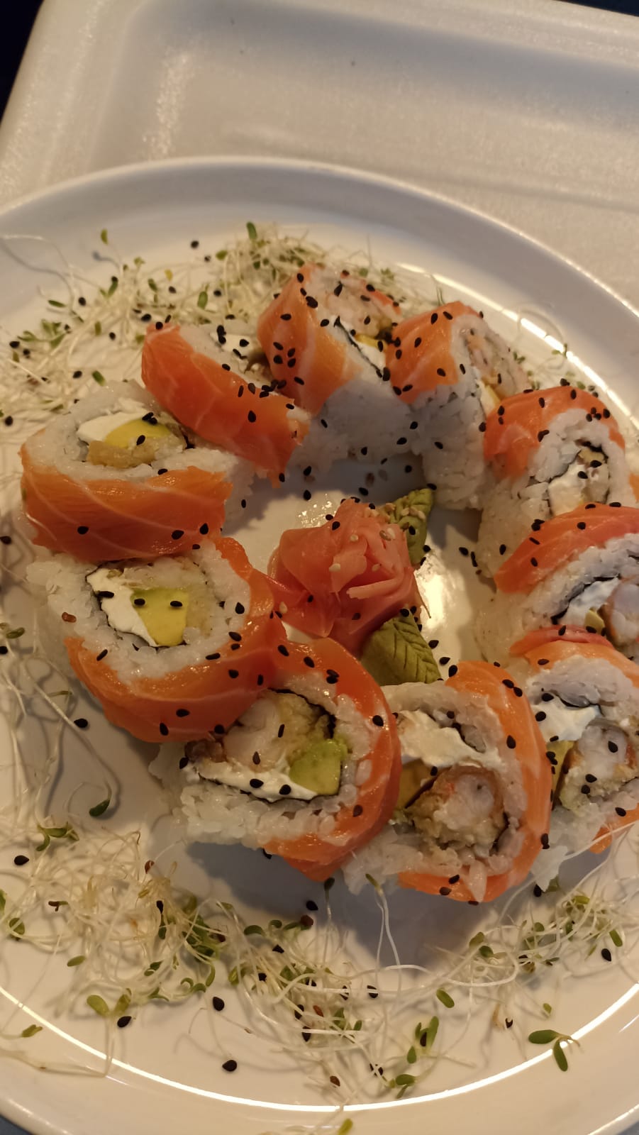 Cangrejo, aguacate, queso crema, pepino, salmón y atún.