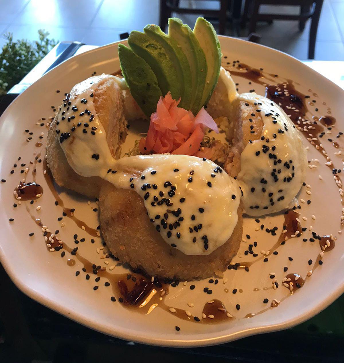 Camarón capeado aguacate queso philadelphia forrado de atún y bañado de camarón spicy.