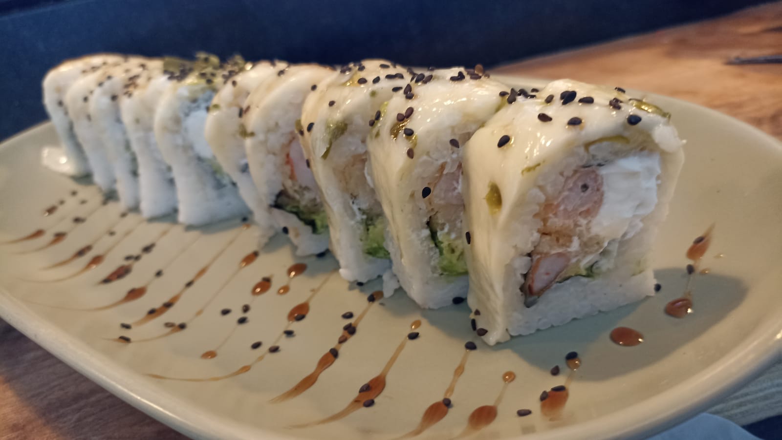 Res, camarón, aguacate y queso philadelphia.