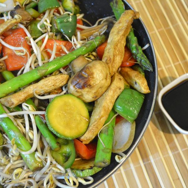 Pollo y verduras a la plancha con arroz frito y germinado de soya.